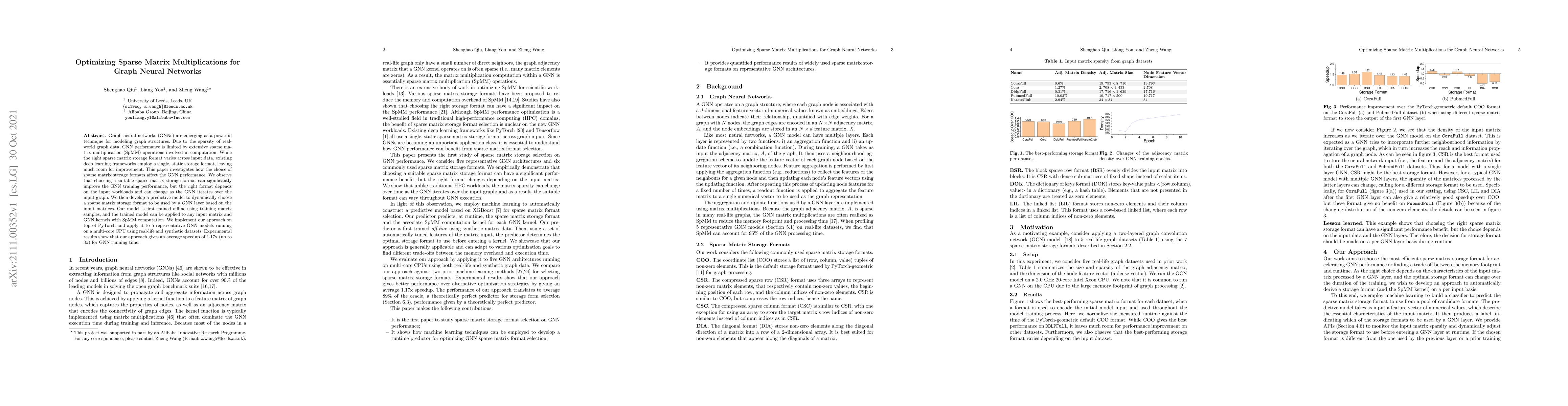 This paper explores optimizing sparse matrix multiplications in graph neural networks (GNNs) by dynamically selecting the most efficient sparse matrix storage format based on input workloads. The proposed predictive model, trained offline, achieves an average speedup of 1.17x (up to 3x) in GNN training performance across various real-life and synthetic datasets.
