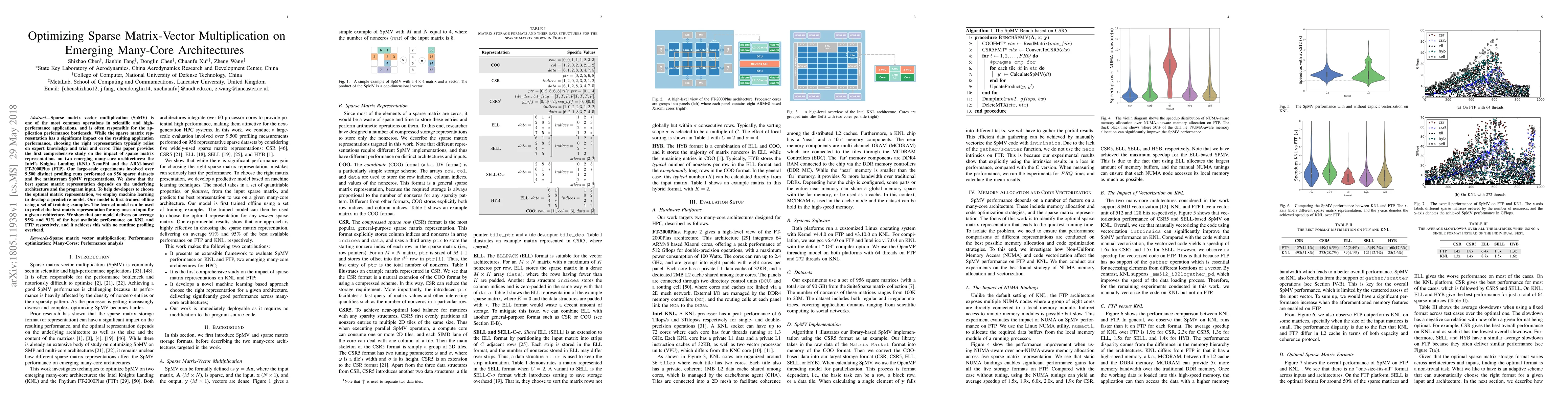 This paper investigates the optimal sparse matrix representation for SpMV on two many-core architectures: Intel's KNL and ARM's FT-2000Plus. It employs machine learning to develop a predictive model that recommends the best representation for any input, achieving 95% and 91% of optimal performance on the respective architectures without runtime overhead.