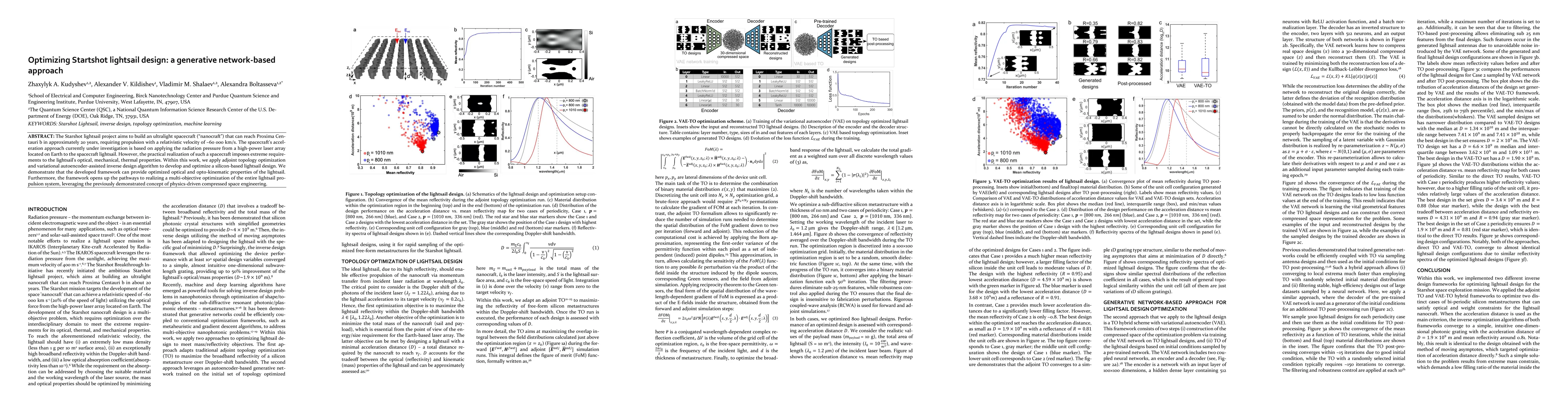 This paper optimizes the design of a lightsail for the Starshot initiative using generative networks, achieving improved optical and mechanical properties through adjoint topology optimization and variational autoencoder-assisted inverse design. The framework also enables multi-objective optimization for the entire propulsion system.