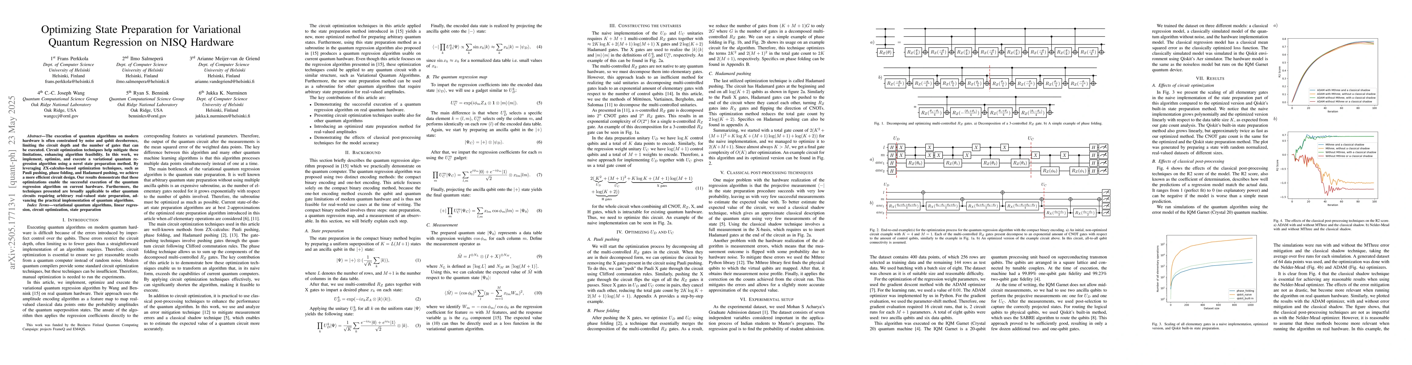 The research implements, optimizes, and executes a variational quantum regression algorithm using a novel state preparation method based on ZX-calculus-optimization techniques such as Pauli pushing, phase folding, and Hadamard pushing.