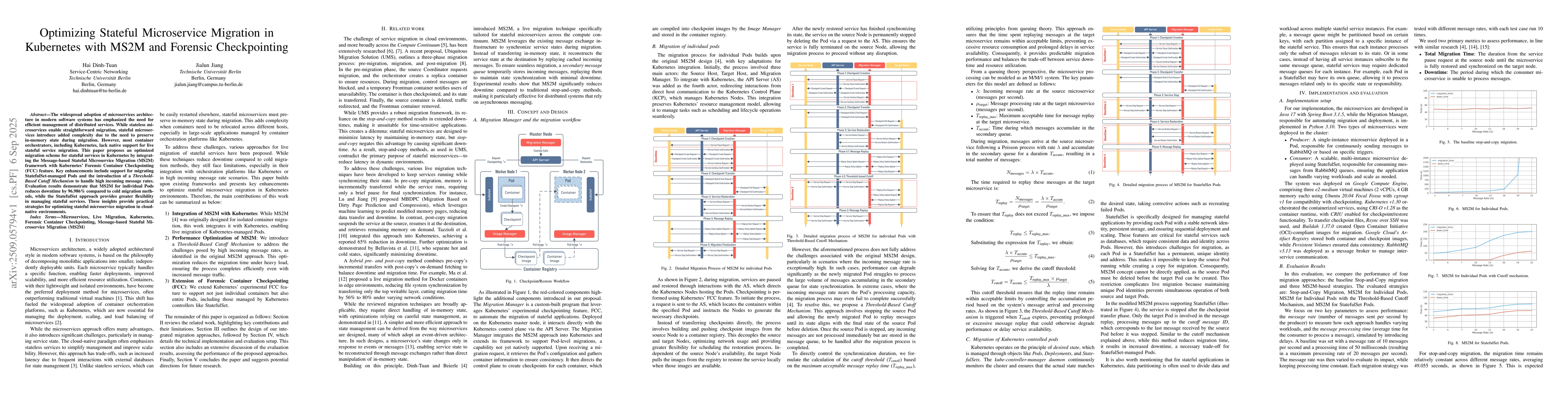 The widespread adoption of microservices architecture in modern software systems has emphasized the need for efficient management of distributed services. While stateless microservices enable straightforward migration, stateful microservices introduce added complexity due to the need to preserve in-memory state during migration. However, most container orchestrators, including Kubernetes, lack native support for live stateful service migration. This paper proposes an optimized migration scheme for stateful services in Kubernetes by integrating the Message-based Stateful Microservice Migration (MS2M) framework with Kubernetes' Forensic Container Checkpointing (FCC) feature. Key enhancements include support for migrating StatefulSet-managed Pods and the introduction of a Threshold-Based Cutoff Mechanism to handle high incoming message rates. Evaluation results demonstrate that MS2M for individual Pods reduces downtime by 96.986% compared to cold migration methods, while the StatefulSet approach provides greater flexibility in managing stateful services. These insights provide practical strategies for optimizing stateful microservice migration in cloud-native environments.