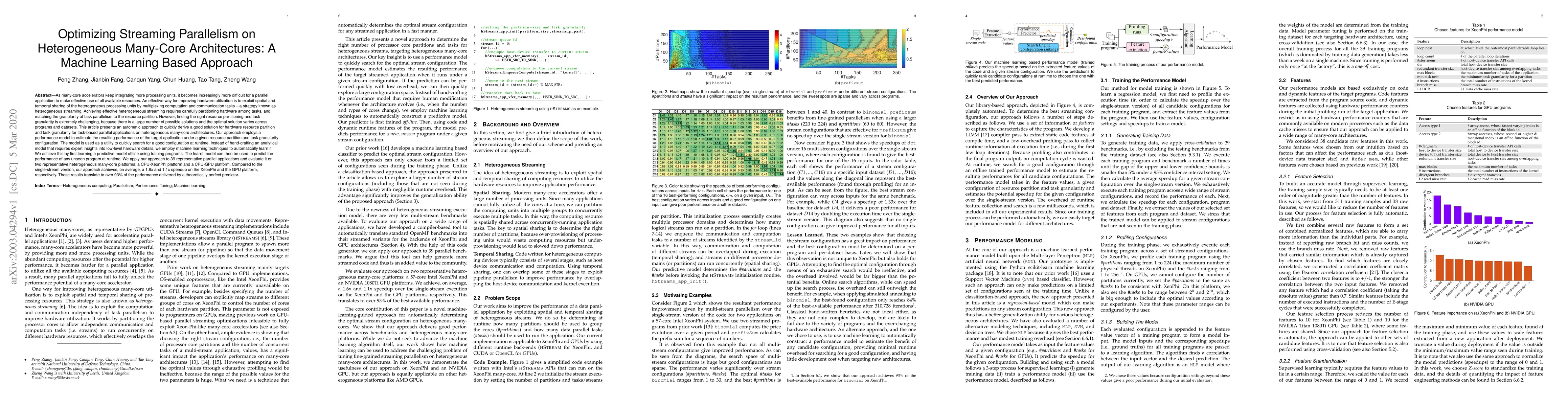 This paper proposes a machine learning-based method to automatically optimize streaming parallelism on heterogeneous many-core architectures by predicting performance for different resource partitions and task granularities. The approach achieves significant speedup on CPU-XeonPhi and CPU-GPU platforms compared to a single-stream version.