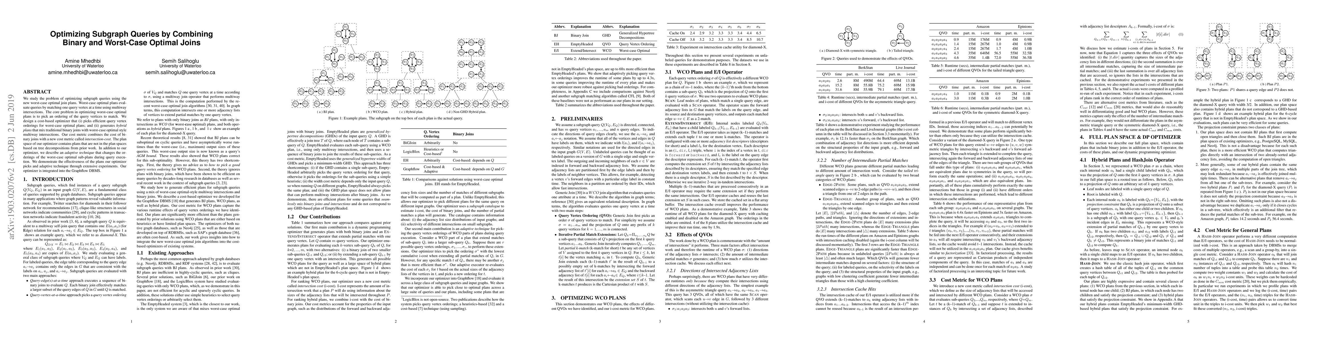 This research proposes a cost-based optimizer for improving subgraph query performance by selecting efficient vertex orderings for worst-case optimal join plans and generating hybrid plans that blend binary joins with multiway intersections. The optimizer demonstrates effectiveness through extensive experiments and is integrated into the Graphflow DBMS.