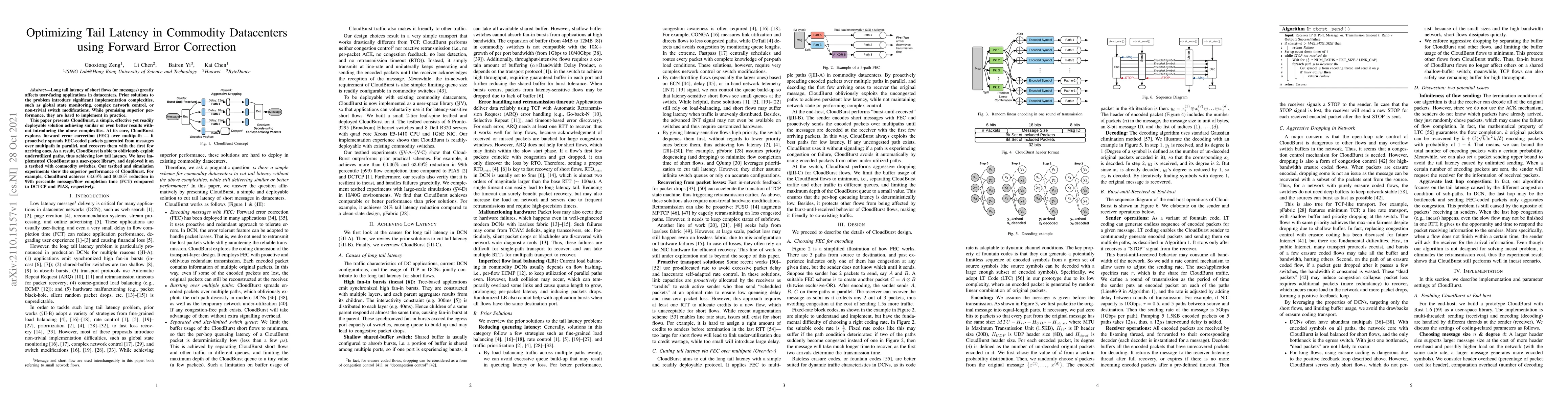 Long tail latency of short flows (or messages) greatly affects user-facing applications in datacenters. Prior solutions to the problem introduce significant implementation complexities, such as global state monitoring, complex network control, or non-trivial switch modifications. While promising superior performance, they are hard to implement in practice. This paper presents CloudBurst, a simple, effective yet readily deployable solution achieving similar or even better results without introducing the above complexities. At its core, CloudBurst explores forward error correction (FEC) over multipath - it proactively spreads FEC-coded packets generated from messages over multipath in parallel, and recovers them with the first few arriving ones. As a result, CloudBurst is able to obliviously exploit underutilized paths, thus achieving low tail latency. We have implemented CloudBurst as a user-space library, and deployed it on a testbed with commodity switches. Our testbed and simulation experiments show the superior performance of CloudBurst. For example, CloudBurst achieves 63.69% and 60.06% reduction in 99th percentile message/flow completion time (FCT) compared to DCTCP and PIAS, respectively.
