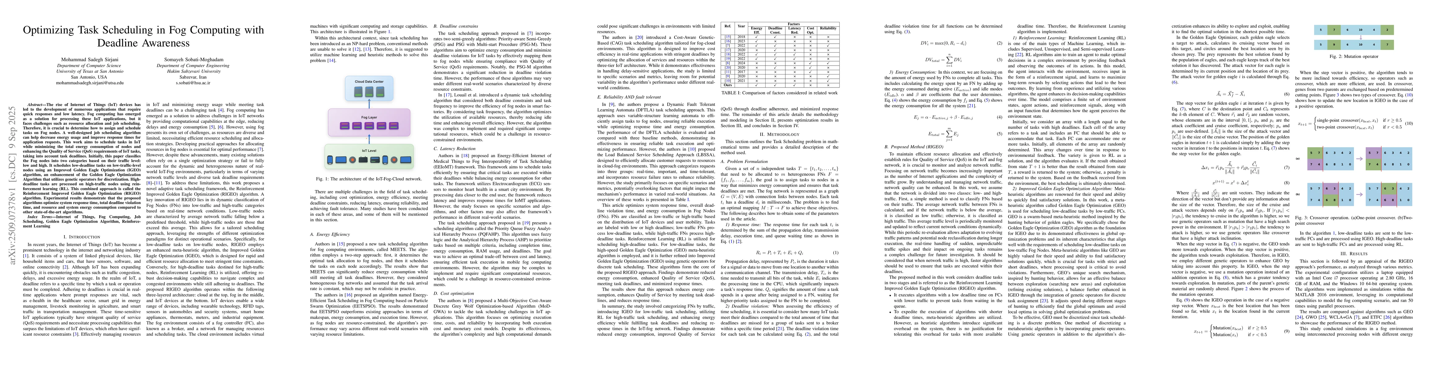 The rise of Internet of Things (IoT) devices has led to the development of numerous applications that require quick responses and low latency. Fog computing has emerged as a solution for processing these IoT applications, but it faces challenges such as resource allocation and job scheduling. Therefore, it is crucial to determine how to assign and schedule tasks on Fog nodes. A well-designed job scheduling algorithm can help decrease energy usage and improve response times for application requests. This work aims to schedule tasks in IoT while minimizing the total energy consumption of nodes and enhancing the Quality of Service (QoS) requirements of IoT tasks, taking into account task deadlines. Initially, this paper classifies the Fog nodes into two categories based on their traffic level: low and high. It schedules low-deadline tasks on low-traffic-level nodes using an Improved Golden Eagle Optimization (IGEO) algorithm, an enhancement of the Golden Eagle Optimization Algorithm that utilizes genetic operators for discretization. High-deadline tasks are processed on high-traffic nodes using reinforcement learning (RL). This combined approach is called the Reinforcement Improved Golden Eagle Optimization (RIGEO) algorithm. Experimental results demonstrate that the proposed algorithms optimize system response time, total deadline violation time, and resource and system energy consumption compared to other state-of-the-art algorithms.