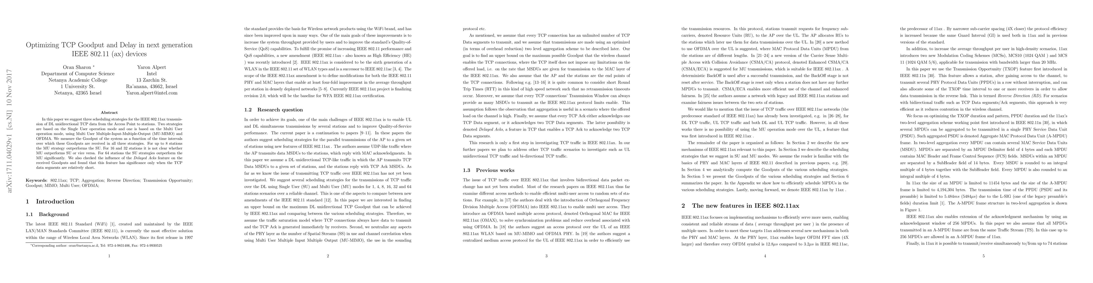 The paper introduces and compares three scheduling strategies for optimizing TCP goodput and delay in IEEE 802.11ax networks, providing an analytical model and simulation results.