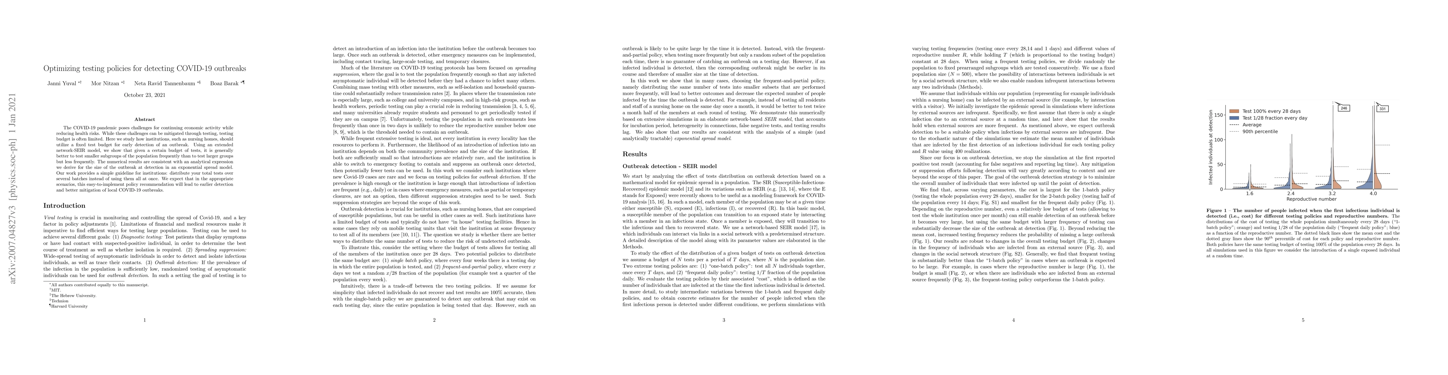 This paper investigates optimal testing strategies for early detection of COVID-19 outbreaks within institutions like nursing homes, given limited testing budgets. It concludes that frequent testing of smaller groups is more effective than infrequent testing of larger groups, suggesting a guideline to distribute tests over multiple batches for earlier detection and better outbreak control.