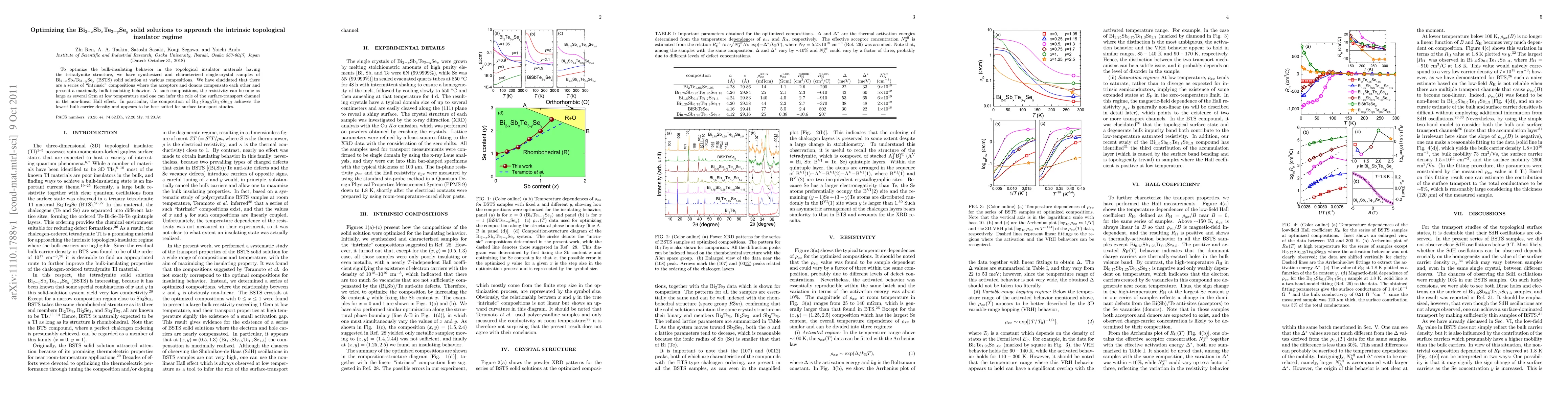 This research optimizes Bi_(2-x)Sb_(x)Te_(3-y)Se_(y) solid solutions to achieve intrinsic topological insulator behavior, identifying compositions with minimal bulk carriers and high resistivity. The composition Bi1.5Sb0.5Te1.7Se1.3 shows the lowest bulk carrier density, ideal for surface transport studies.