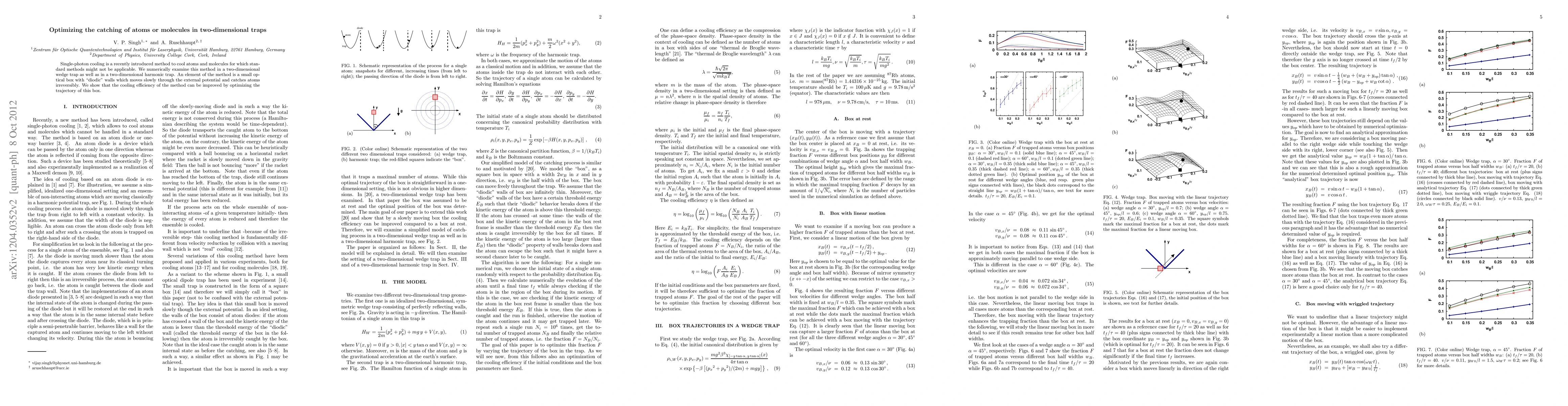 This paper investigates single-photon cooling to optimize the trapping and cooling of atoms and molecules in two-dimensional traps, demonstrating that cooling efficiency can be enhanced by refining the optical dipole box's trajectory. Numerical simulations are conducted for both wedge and harmonic traps.
