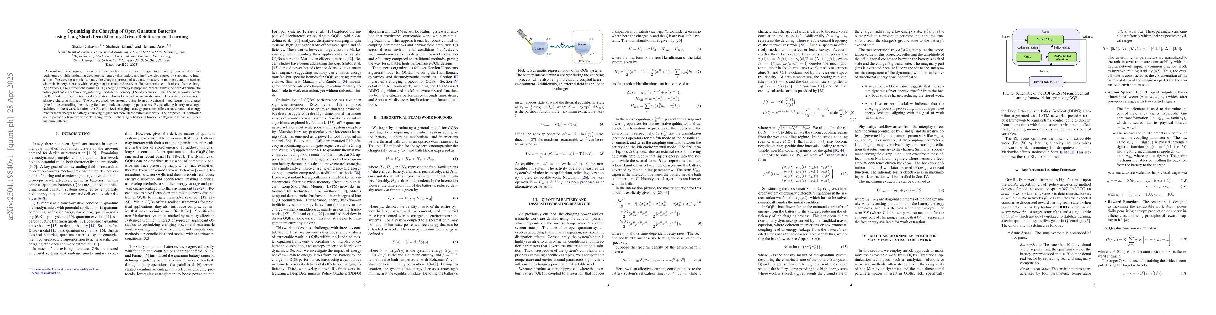 The research proposes a model for charging an open quantum battery, employing reinforcement learning with deep deterministic policy gradient and LSTM networks to adaptively control charging parameters in real-time, optimizing energy transfer efficiency.