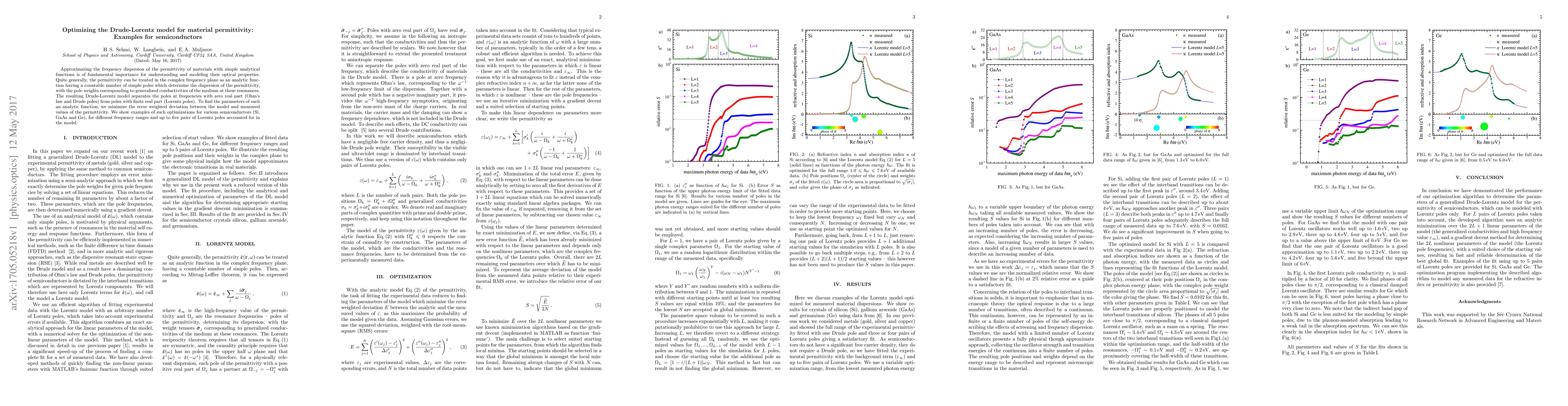 Approximating the frequency dispersion of the permittivity of materials with simple analytical functions is of fundamental importance for understanding and modeling their optical properties. Quite generally, the permittivity can be treated in the complex frequency plane as an analytic function having a countable number of simple poles which determine the dispersion of the permittivity, with the pole weights corresponding to generalized conductivities of the medium at these resonances. The resulting Drude-Lorentz model separates the poles at frequencies with zero real part (Ohm's law and Drude poles) from poles with finite real part (Lorentz poles). To find the parameters of such an analytic function, we minimize the error weighted deviation between the model and measured values of the permittivity. We show examples of such optimizations for various semiconductors (Si, GaAs and Ge), for different frequency ranges and up to five pairs of Lorentz poles accounted for in the model.