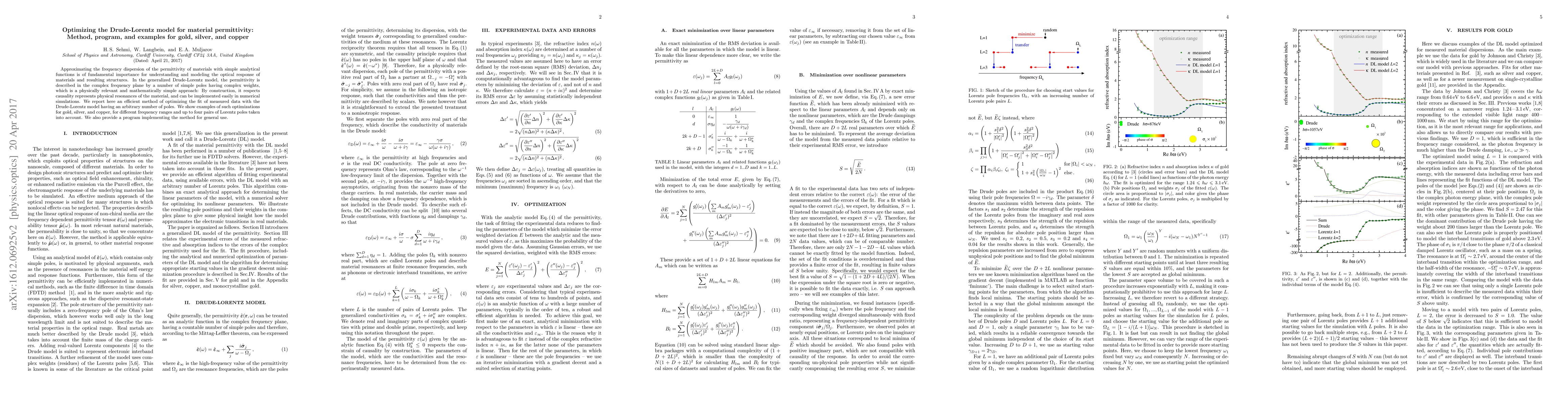 Approximating the frequency dispersion of the permittivity of materials with simple analytical functions is of fundamental importance for understanding and modeling the optical response of materials and resulting structures. In the generalized Drude-Lorentz model, the permittivity is described in the complex frequency plane by a number of simple poles having complex weights, which is a physically relevant and mathematically simple approach: By construction, it respects causality represents physical resonances of the material, and can be implemented easily in numerical simulations. We report here an efficient method of optimizing the fit of measured data with the Drude-Lorentz model having an arbitrary number of poles. We show examples of such optimizations for gold, silver, and copper, for different frequency ranges and up to four pairs of Lorentz poles taken into account. We also provide a program implementing the method for general use.