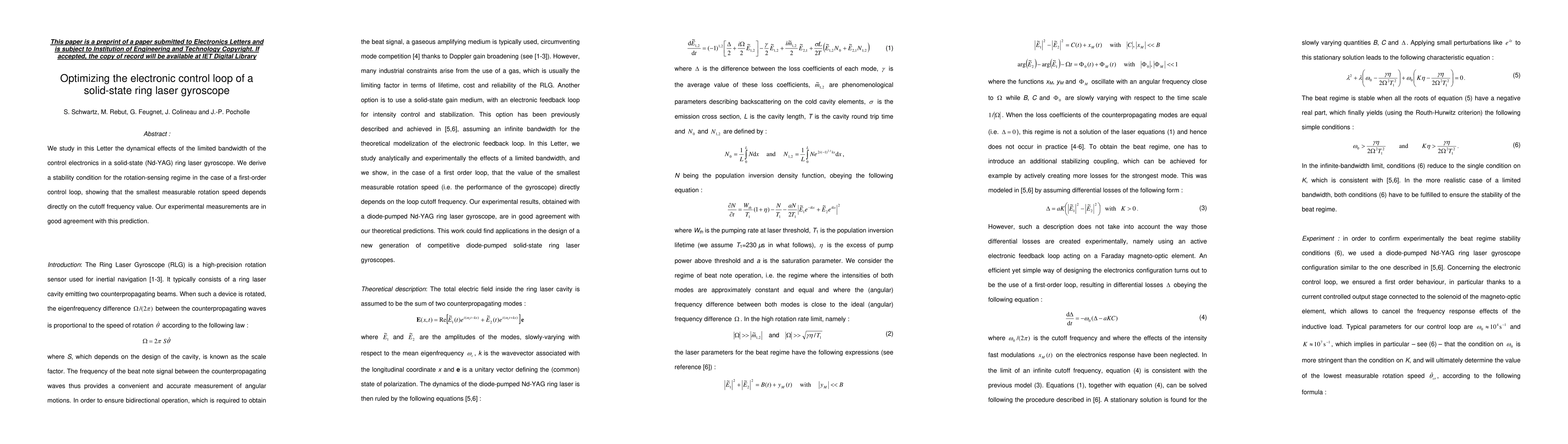 This paper investigates the impact of control electronics bandwidth on a solid-state ring laser gyroscope's performance, deriving a stability condition for rotation sensing. Experimental results confirm that the smallest measurable rotation speed is directly influenced by the control loop's cutoff frequency.