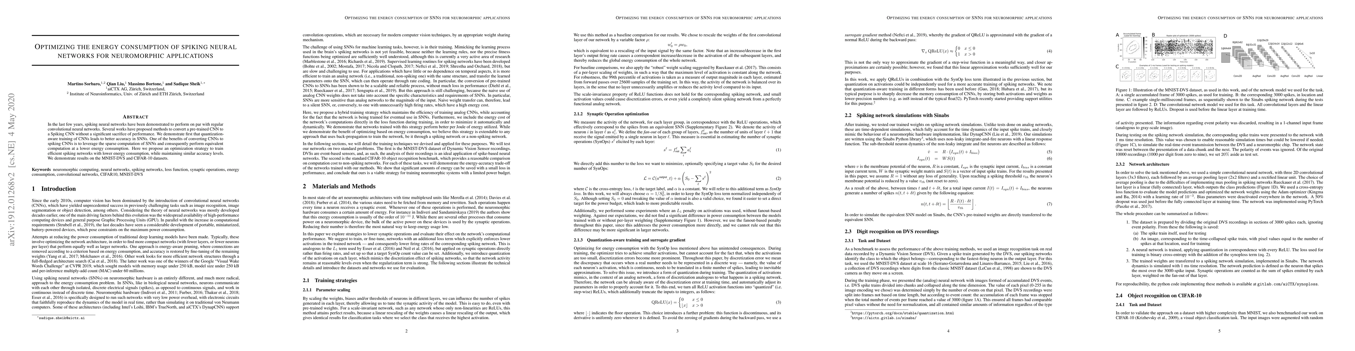 This paper proposes an optimization strategy to train spiking neural networks (SNNs) for neuromorphic applications, focusing on reducing energy consumption while maintaining performance. The authors show that quantization-aware training of convolutional neural networks (CNNs) enhances SNN accuracy, and they demonstrate the effectiveness of their method on MNIST-DVS and CIFAR-10 datasets.