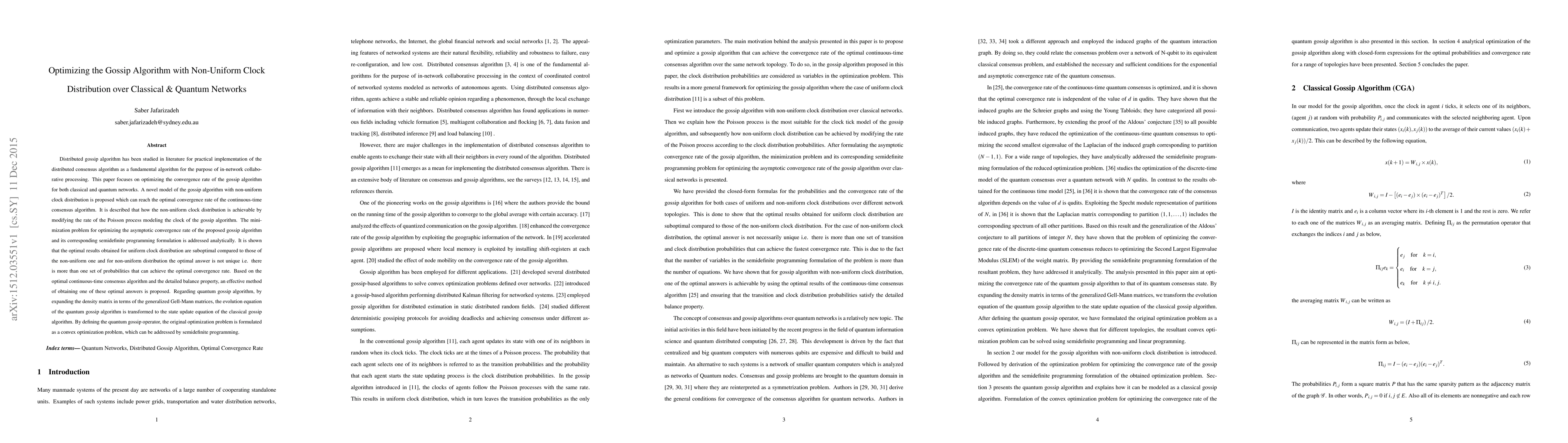 This paper optimizes the gossip algorithm's convergence rate for both classical and quantum networks using a non-uniform clock distribution. It proposes a novel model that achieves optimal convergence, demonstrating that non-uniform distributions outperform uniform ones, and introduces a method to derive one optimal solution. For quantum networks, it transforms the quantum gossip algorithm into a classical form and formulates the optimization problem as a convex optimization solvable via semidefinite programming.