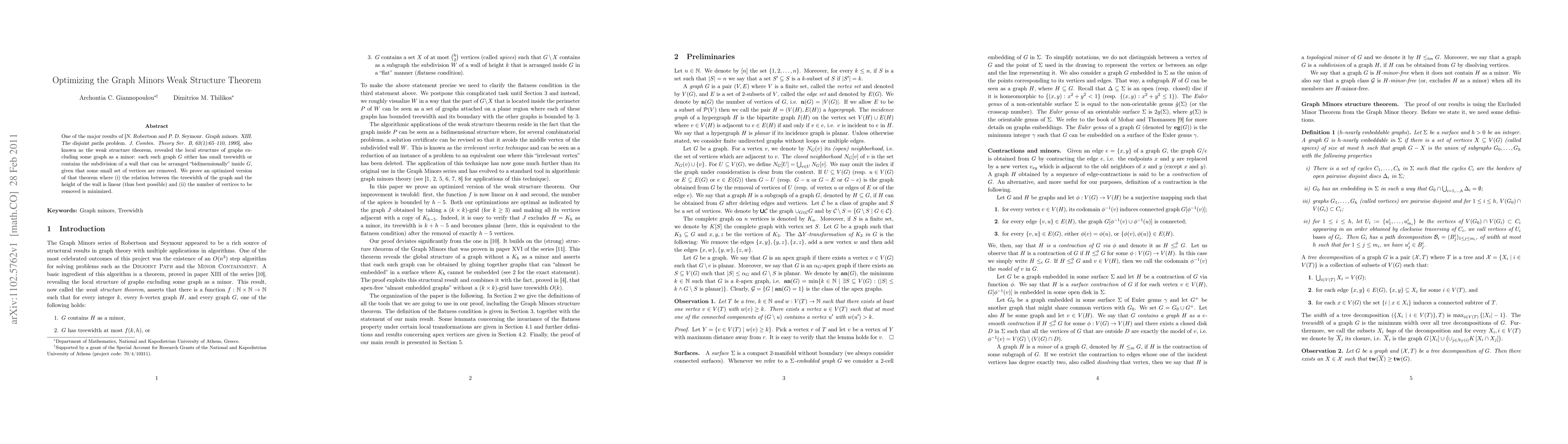 This paper optimizes the graph minors weak structure theorem by proving a version where the treewidth-to-wall height relation is linear and the number of vertices to be removed is minimized. This improves upon the original theorem by Robertson and Seymour.