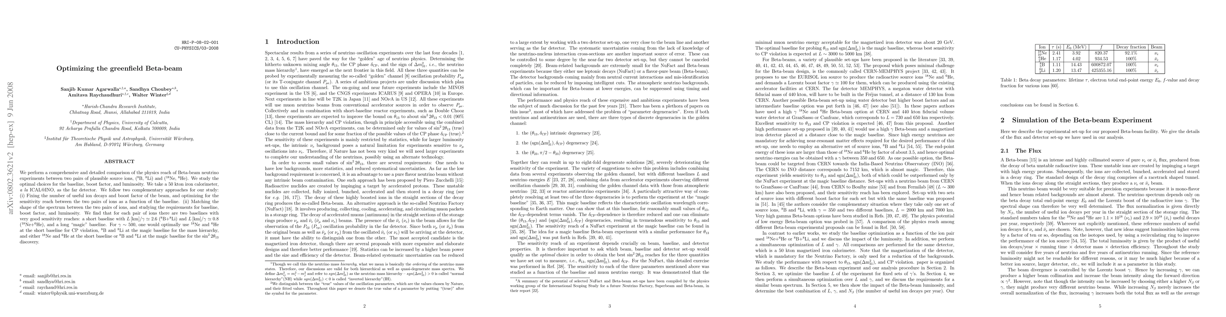 We perform a comprehensive and detailed comparison of the physics reach of Beta-beam neutrino experiments between two pairs of plausible source ions, (8B, 8Li) and (18Ne, 6He). We study the optimal choices for the baseline, boost factor, and luminosity. We take a 50 kton iron calorimeter, a la ICAL@INO, as the far detector. We follow two complementary approaches for our study: (i) Fixing the number of useful ion decays and boost factor of the beam, and optimizing for the sensitivity reach between the two pairs of ions as a function of the baseline. (ii) Matching the shape of the spectrum between the two pairs of ions, and studying the requirements for baseline, boost factor, and luminosity. We find that for each pair of ions there are two baselines with very good sensitivity reaches: a short baseline with $L [km]/ \gamma \simeq 2.6$ (8B+8Li) and $L [km]/\gamma \simeq 0.8$ (18Ne+6He), and a long ``magic'' baseline. For $\gamma \sim 500$, one would optimally use 18Ne and 6He at the short baseline for CP violation, 8B and 8Li at the magic baseline for the mass hierarchy, and either 18Ne and 6He at the short baseline or 8B and 8Li at the magic baseline for the $\sin^22\theta_{13}$ discovery.