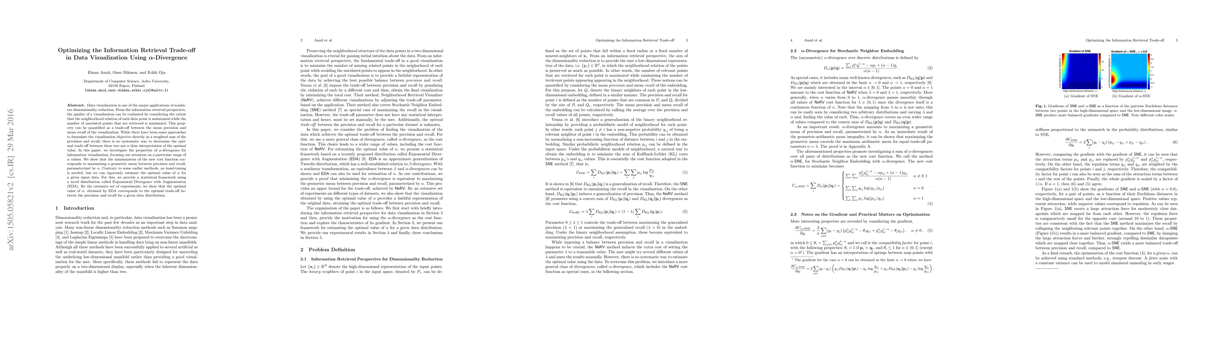 Data visualization is one of the major applications of nonlinear dimensionality reduction. From the information retrieval perspective, the quality of a visualization can be evaluated by considering the extent that the neighborhood relation of each data point is maintained while the number of unrelated points that are retrieved is minimized. This property can be quantified as a trade-off between the mean precision and mean recall of the visualization. While there have been some approaches to formulate the visualization objective directly as a weighted sum of the precision and recall, there is no systematic way to determine the optimal trade-off between these two nor a clear interpretation of the optimal value. In this paper, we investigate the properties of $\alpha$-divergence for information visualization, focusing our attention on a particular range of $\alpha$ values. We show that the minimization of the new cost function corresponds to maximizing a geometric mean between precision and recall, parameterized by $\alpha$. Contrary to some earlier methods, no hand-tuning is needed, but we can rigorously estimate the optimal value of $\alpha$ for a given input data. For this, we provide a statistical framework using a novel distribution called Exponential Divergence with Augmentation (EDA). By the extensive set of experiments, we show that the optimal value of $\alpha$, obtained by EDA corresponds to the optimal trade-off between the precision and recall for a given data distribution.
