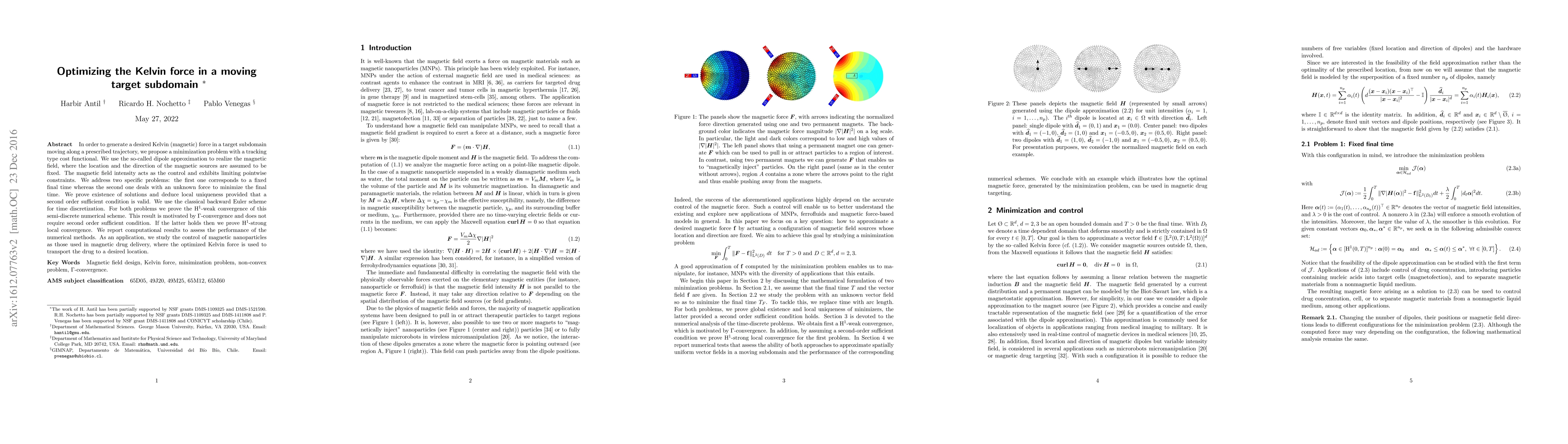 In order to generate a desired Kelvin (magnetic) force in a target subdomain moving along a prescribed trajectory, we propose a minimization problem with a tracking type cost functional. We use the so-called dipole approximation to realize the magnetic field, where the location and the direction of the magnetic sources are assumed to be fixed. The magnetic field intensity acts as the control and exhibits limiting pointwise constraints. We address two specific problems: the first one corresponds to a fixed final time whereas the second one deals with an unknown force to minimize the final time. We prove existence of solutions and deduce local uniqueness provided that a second order sufficient condition is valid. We use the classical backward Euler scheme for time discretization. For both problems we prove the $H^1$-weak convergence of this semi-discrete numerical scheme. This result is motivated by $\Gamma$-convergence and does not require second order sufficient condition. If the latter holds then we prove $H^1$-strong local convergence. We report computational results to assess the performance of the numerical methods. As an application, we study the control of magnetic nanoparticles as those used in magnetic drug delivery, where the optimized Kelvin force is used to transport the drug to a desired location.