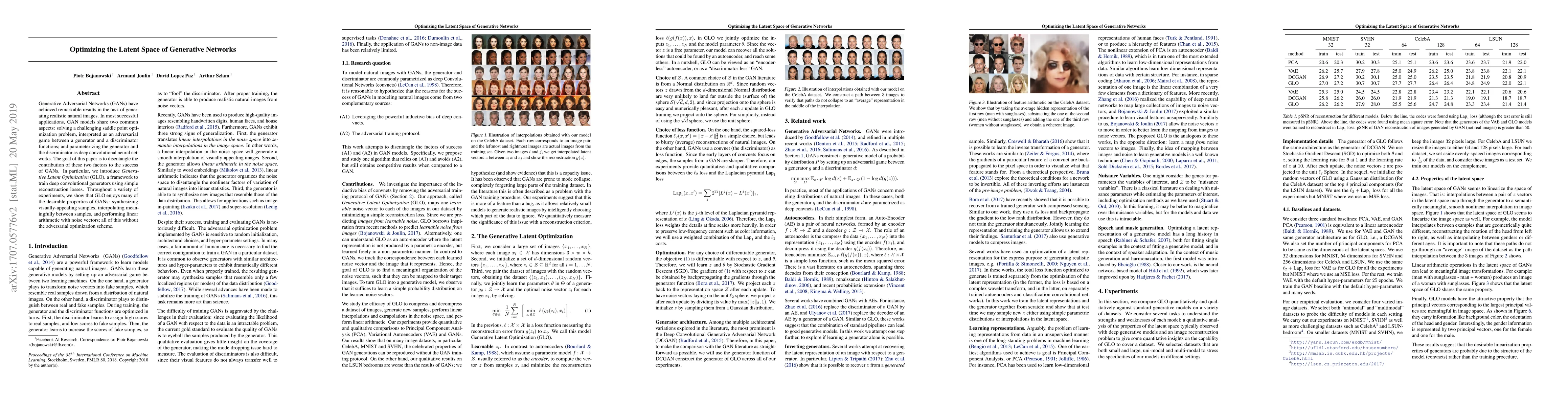 Generative Adversarial Networks (GANs) have achieved remarkable results in the task of generating realistic natural images. In most successful applications, GAN models share two common aspects: solving a challenging saddle point optimization problem, interpreted as an adversarial game between a generator and a discriminator functions; and parameterizing the generator and the discriminator as deep convolutional neural networks. The goal of this paper is to disentangle the contribution of these two factors to the success of GANs. In particular, we introduce Generative Latent Optimization (GLO), a framework to train deep convolutional generators using simple reconstruction losses. Throughout a variety of experiments, we show that GLO enjoys many of the desirable properties of GANs: synthesizing visually-appealing samples, interpolating meaningfully between samples, and performing linear arithmetic with noise vectors; all of this without the adversarial optimization scheme.