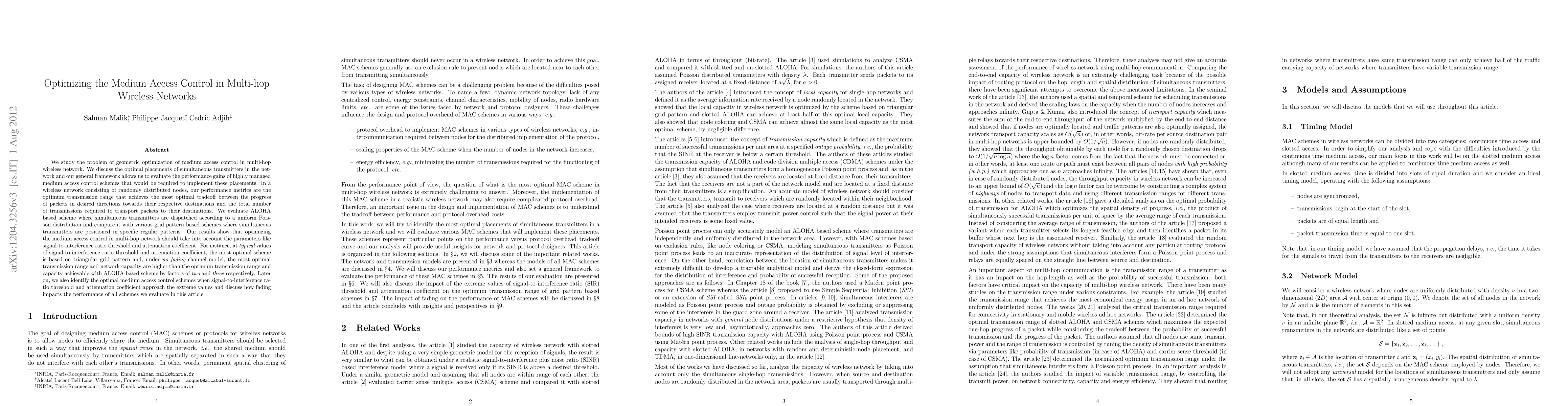 This paper explores geometric optimization of medium access control in multi-hop wireless networks, focusing on optimal transmitter placements and performance gains. It finds that a triangular grid pattern outperforms the ALOHA scheme, achieving higher network capacity and optimal transmission range under typical conditions, while also considering factors like signal-to-interference ratio and attenuation coefficient.