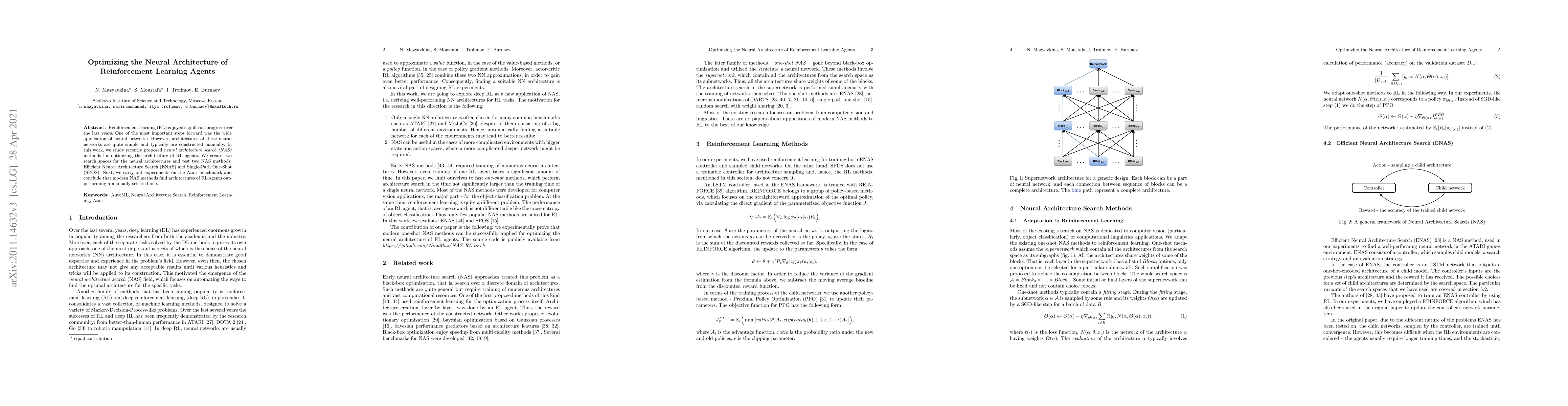 Reinforcement learning (RL) enjoyed significant progress over the last years. One of the most important steps forward was the wide application of neural networks. However, architectures of these neural networks are typically constructed manually. In this work, we study recently proposed neural architecture search (NAS) methods for optimizing the architecture of RL agents. We carry out experiments on the Atari benchmark and conclude that modern NAS methods find architectures of RL agents outperforming a manually selected one.