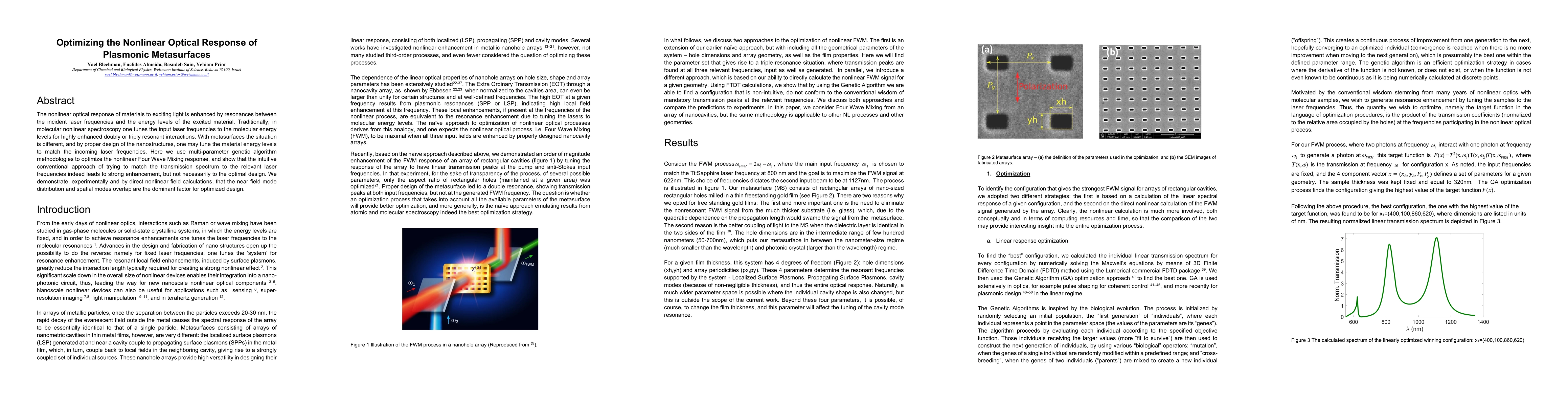 This paper optimizes the nonlinear optical response of plasmonic metasurfaces using genetic algorithms, finding that matching material energy levels to laser frequencies is not the sole factor for optimal design. Instead, near-field mode distribution and spatial mode overlap are crucial for enhancing the nonlinear Four Wave Mixing response.