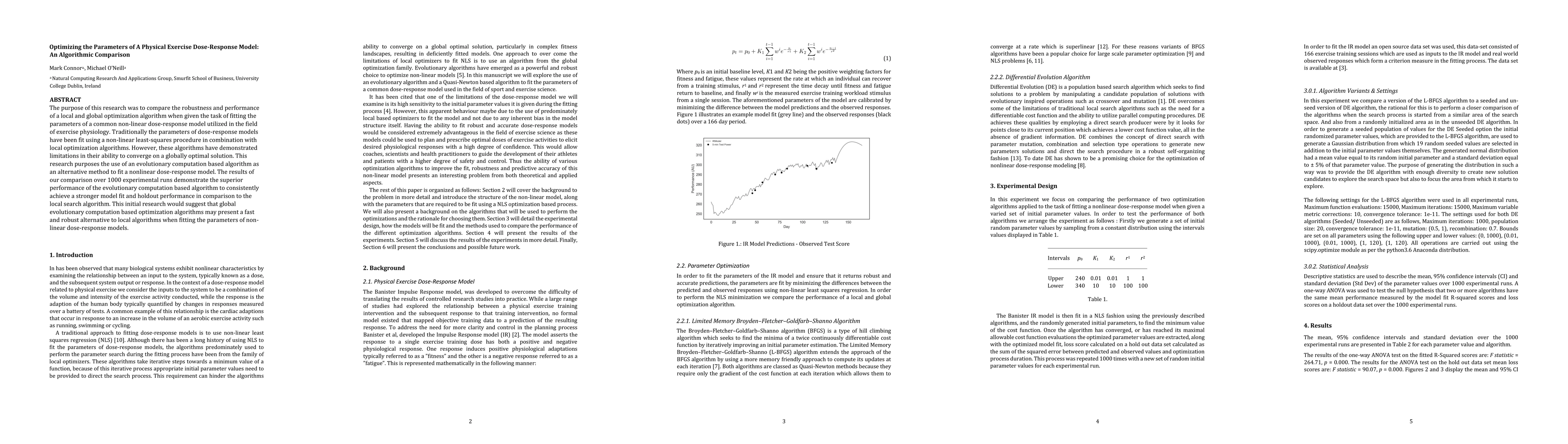 This research compares the performance of local and global optimization algorithms for fitting parameters in a non-linear dose-response model used in exercise physiology, finding that evolutionary computation algorithms outperform local search algorithms in achieving better model fit and holdout performance.