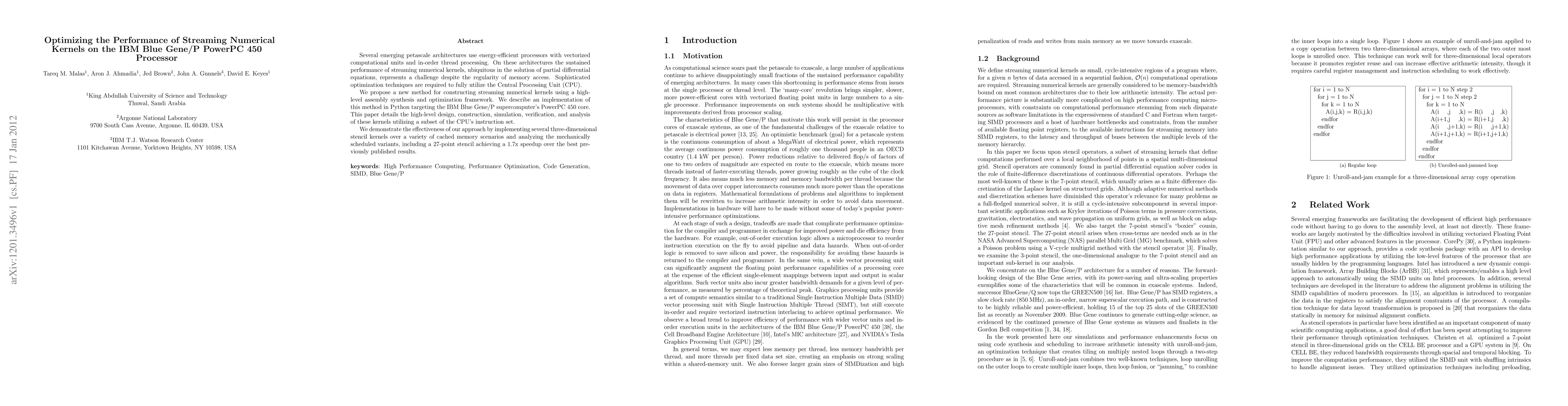 This paper proposes a new method for optimizing streaming numerical kernels on the IBM Blue Gene/P PowerPC 450 processor using a high-level assembly synthesis framework implemented in Python. The method achieves a 1.7x speedup for a 27-point stencil kernel compared to previous results.