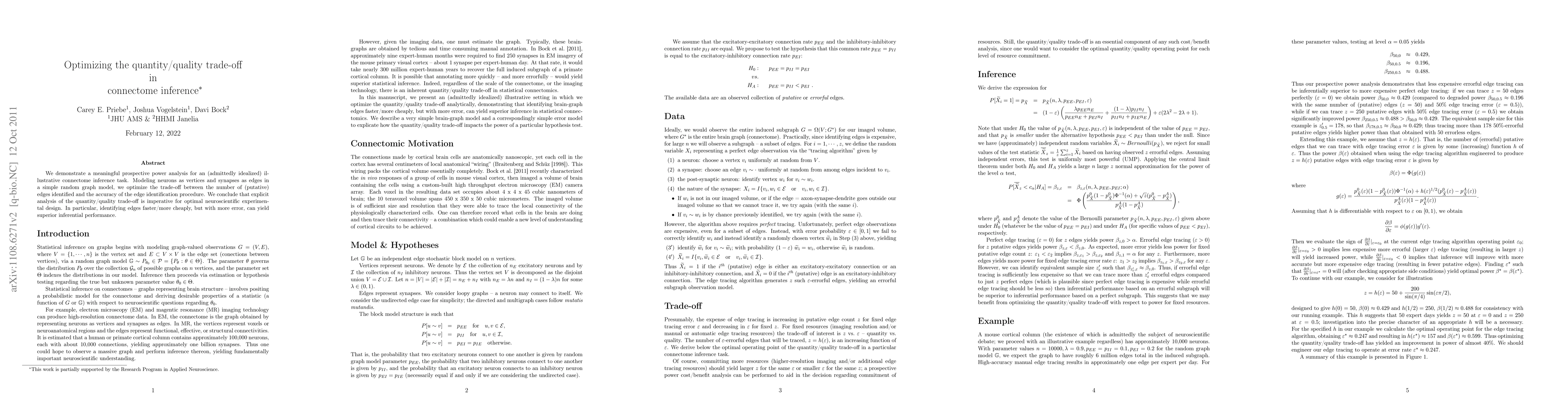 We demonstrate a meaningful prospective power analysis for an (admittedly idealized) illustrative connectome inference task. Modeling neurons as vertices and synapses as edges in a simple random graph model, we optimize the trade-off between the number of (putative) edges identified and the accuracy of the edge identification procedure. We conclude that explicit analysis of the quantity/quality trade-off is imperative for optimal neuroscientific experimental design. In particular, more though more errorful edge identification can yield superior inferential performance.