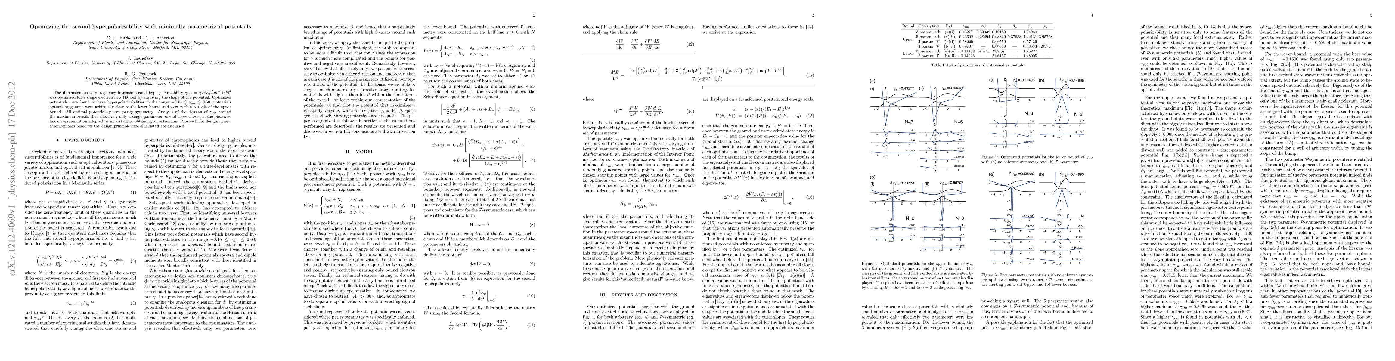 This paper optimizes the intrinsic second hyperpolarizability \(\gamma_{int}\) for a single electron in a 1D well by adjusting potential shape, finding optimal values between -0.15 and 0.60. The analysis shows that only one parameter is crucial for achieving the extremum, suggesting a simplified design for new chromophores.