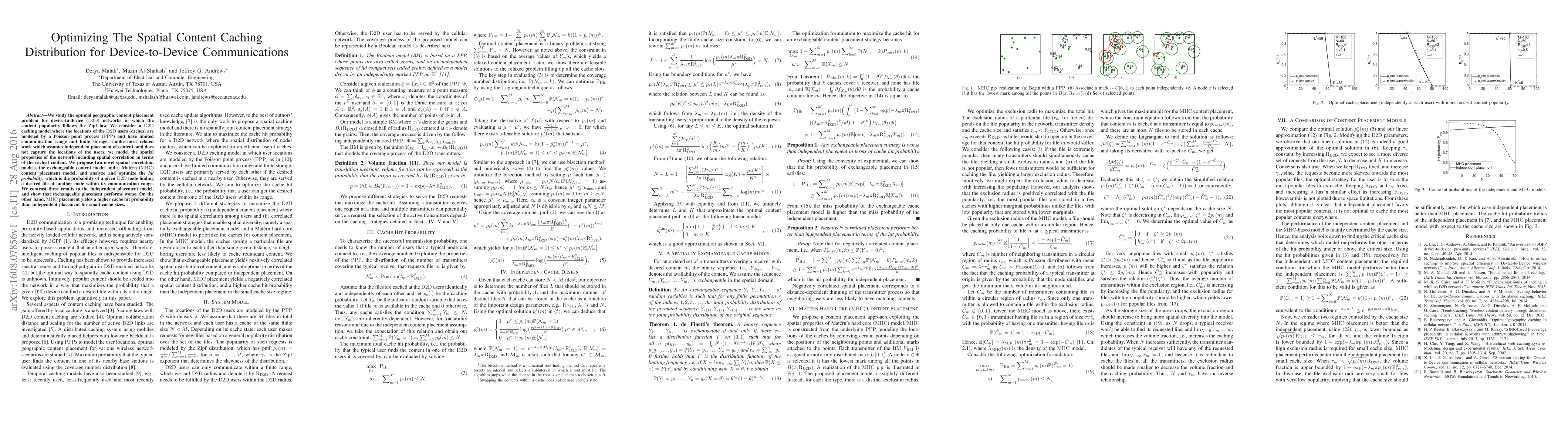 This paper optimizes the geographic distribution of cached content in device-to-device networks, considering spatial correlations and the Zipf law of content popularity. The authors propose two spatial correlation models, showing that the Matérn content placement model (MHC) significantly improves hit probability compared to the independent placement model, especially for small cache sizes.