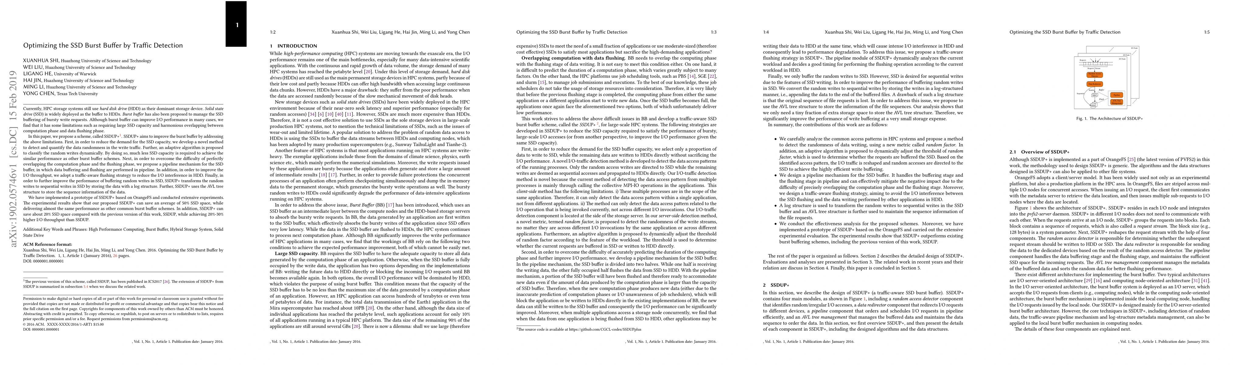 This paper proposes SSDUP+, a scheme to optimize the SSD burst buffer by detecting and classifying data randomness to reduce SSD capacity requirements and employing a pipeline mechanism for efficient data buffering and flushing. The results show SSDUP+ saves 50% SSD space and achieves 20%-30% higher I/O throughput compared to other schemes.
