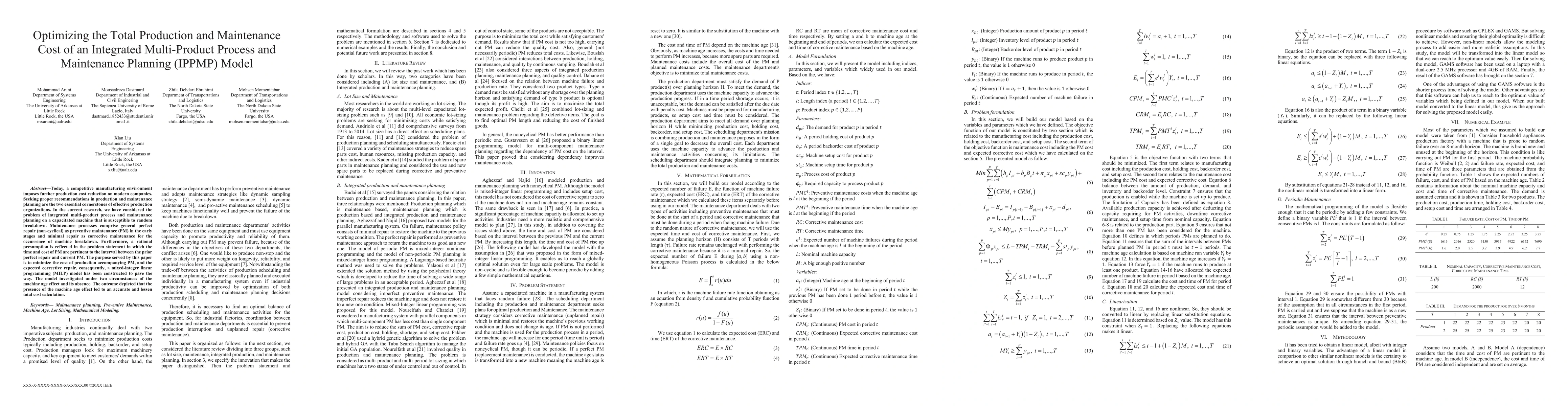 A study optimizes production and maintenance costs using a mixed-integer linear programming model that considers machine age effects, aiming to minimize total cost of production and corrective repair.