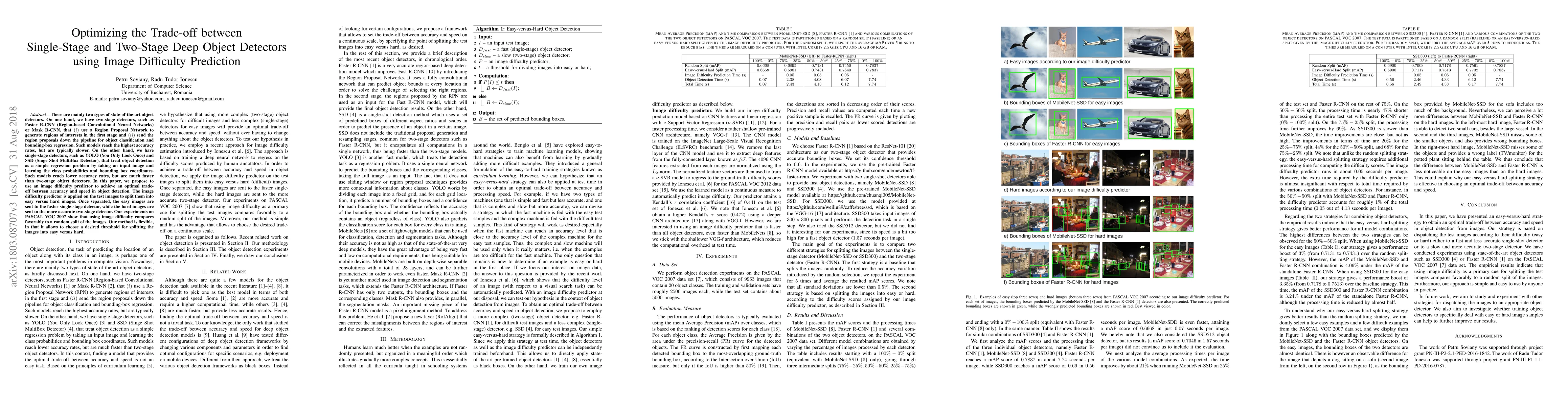 This paper proposes a method to balance accuracy and speed in object detection by using an image difficulty predictor. It classifies images as easy or hard, routing the former to faster single-stage detectors and the latter to more accurate two-stage detectors. Experiments on PASCAL VOC 2007 show that this approach outperforms random image splitting, offering flexibility in choosing the difficulty threshold.