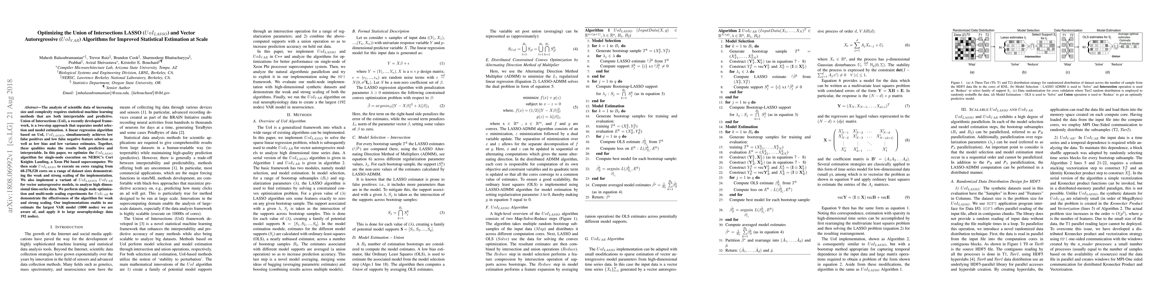 The analysis of scientific data of increasing size and complexity requires statistical machine learning methods that are both interpretable and predictive. Union of Intersections (UoI), a recently developed framework, is a two-step approach that separates model selection and model estimation. A linear regression algorithm based on UoI, $UoI_{LASSO}$, simultaneously achieves low false positives and low false negative feature selection as well as low bias and low variance estimates. Together, these qualities make the results both predictive and interpretable. In this paper, we optimize the $UoI_{LASSO}$ algorithm for single-node execution on NERSC's Cori Knights Landing, a Xeon Phi based supercomputer. We then scale $UoI_{LASSO}$ to execute on cores ranging from 68-278,528 cores on a range of dataset sizes demonstrating the weak and strong scaling of the implementation. We also implement a variant of $UoI_{LASSO}$, $UoI_{VAR}$ for vector autoregressive models, to analyze high dimensional time-series data. We perform single node optimization and multi-node scaling experiments for $UoI_{VAR}$ to demonstrate the effectiveness of the algorithm for weak and strong scaling. Our implementations enable to use estimate the largest VAR model (1000 nodes) we are aware of, and apply it to large neurophysiology data 192 nodes).