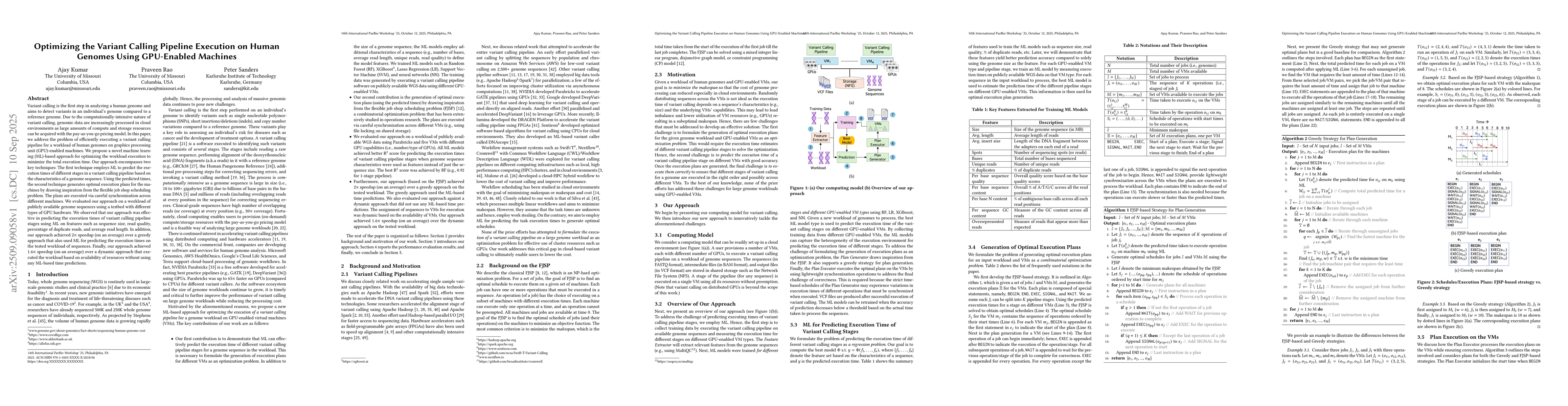 Variant calling is the first step in analyzing a human genome and aims to detect variants in an individual's genome compared to a reference genome. Due to the computationally-intensive nature of variant calling, genomic data are increasingly processed in cloud environments as large amounts of compute and storage resources can be acquired with the pay-as-you-go pricing model. In this paper, we address the problem of efficiently executing a variant calling pipeline for a workload of human genomes on graphics processing unit (GPU)-enabled machines. We propose a novel machine learning (ML)-based approach for optimizing the workload execution to minimize the total execution time. Our approach encompasses two key techniques: The first technique employs ML to predict the execution times of different stages in a variant calling pipeline based on the characteristics of a genome sequence. Using the predicted times, the second technique generates optimal execution plans for the machines by drawing inspiration from the flexible job shop scheduling problem. The plans are executed via careful synchronization across different machines. We evaluated our approach on a workload of publicly available genome sequences using a testbed with different types of GPU hardware. We observed that our approach was effective in predicting the execution times of variant calling pipeline stages using ML on features such as sequence size, read quality, percentage of duplicate reads, and average read length. In addition, our approach achieved 2X speedup (on an average) over a greedy approach that also used ML for predicting the execution times on the tested workload of sequences. Finally, our approach achieved 1.6X speedup (on an average) over a dynamic approach that executed the workload based on availability of resources without using any ML-based time predictions.