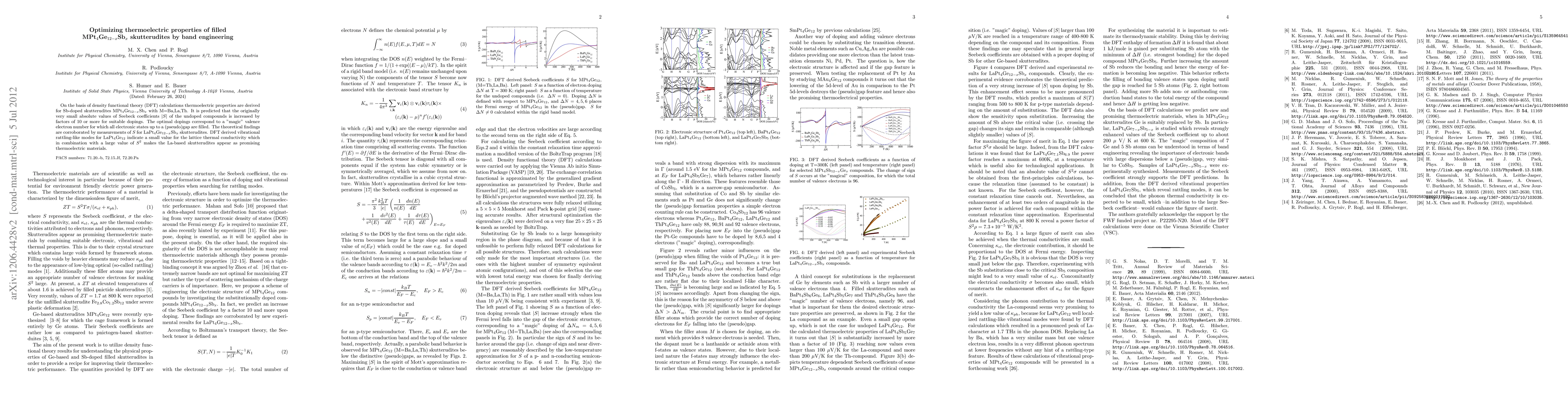 On the basis of density functional theory (DFT) calculations thermoelectric properties are derived for Sb-doped skutterudites MPt$_4$Ge$_{12-x}$Sb$_x$ with M=Ba,La,Th. It is predicted that the originally very small absolute values of Seebeck coefficients $|S|$ of the undoped compounds is increased by factors of 10 or more for suitable dopings. The optimal dopings correspond to a "magic" valence electron number for which all electronic states up to a (pseudo)gap are filled. The theoretical findings are corroborated by measurements of $S$ for LaPt$_4$Ge$_{12-x}$Sb$_x$ skutterudites. DFT derived vibrational rattling-like modes for LaPt$_4$Ge$_{12}$ indicate a small value for the lattice thermal conductivity which in combination with a large value of $S^2$ makes the La-based skutterudites appear as promising thermoelectric materials.