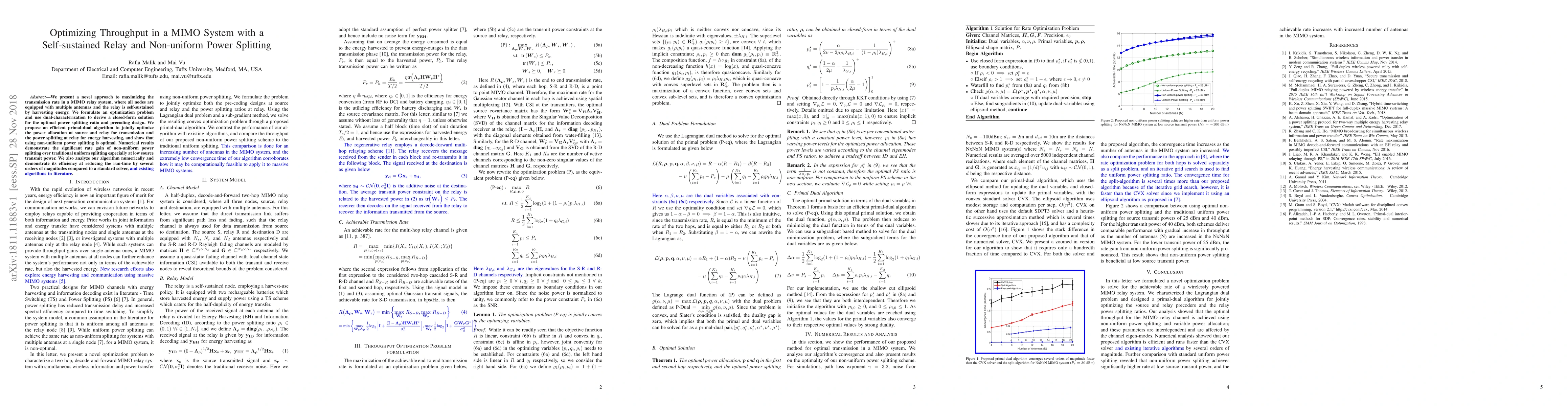 This paper proposes a novel optimization method to maximize throughput in a MIMO relay system with self-sustaining energy harvesting relays. It introduces a closed-form solution for optimal power splitting and precoding, demonstrating significant rate gains through non-uniform power splitting, especially at low transmit power, and an efficient algorithm that reduces computational time significantly.