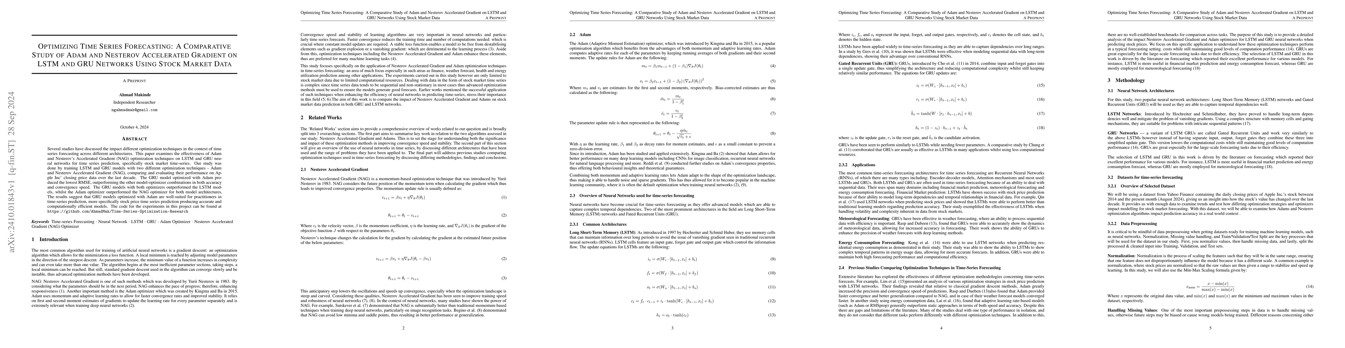 This study compares Adam and Nesterov Accelerated Gradient (NAG) optimizers for LSTM and GRU networks in forecasting stock market time series, finding that GRU models optimized with Adam show the lowest RMSE and outperform other combinations in accuracy and convergence speed. The code is available at [GitHub](https://github.com/AhmadMak/Time-Series-Optimization-Research).