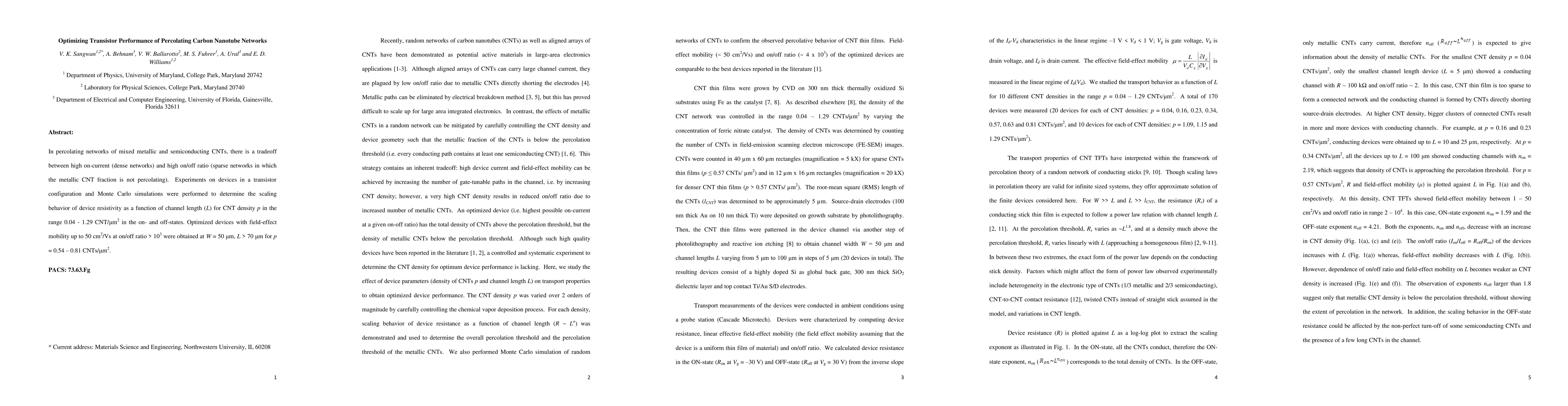 This paper investigates the performance optimization of transistors using percolating carbon nanotube networks, finding a balance between high on-current and high on/off ratio. Experimental and simulation results reveal optimal device performance at specific channel lengths and CNT densities, achieving field-effect mobility up to 50 cm^2/Vs with an on/off ratio greater than 10^3.