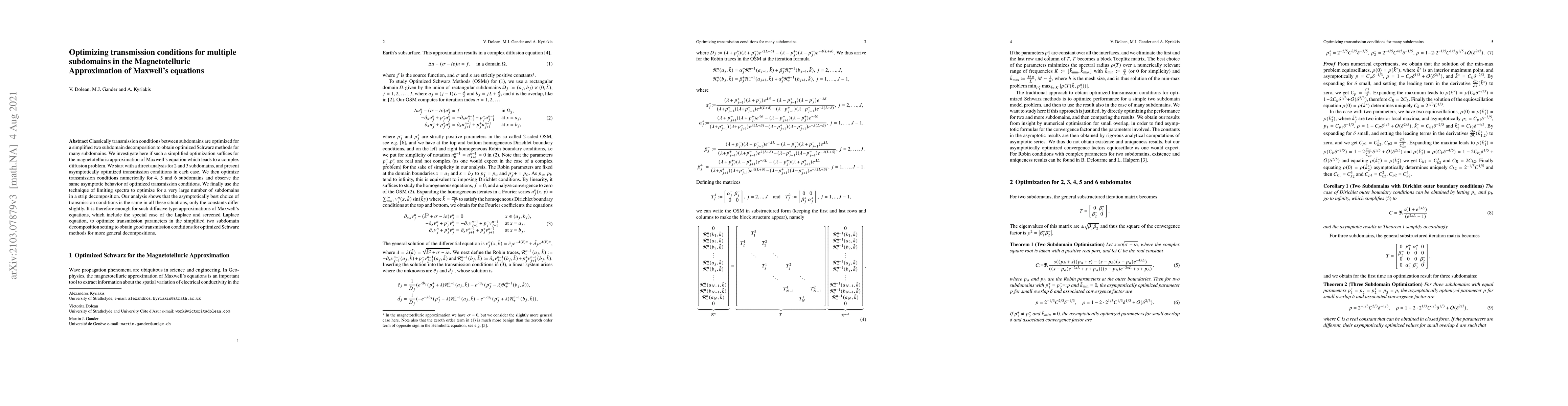 This paper investigates the optimization of transmission conditions for multiple subdomains in the magnetotelluric approximation of Maxwell's equations, demonstrating that simplified two-subdomain optimization suffices for complex diffusion problems. The study finds consistent asymptotic behavior across various subdomain decompositions, indicating that the best transmission conditions can be achieved through simplified settings.