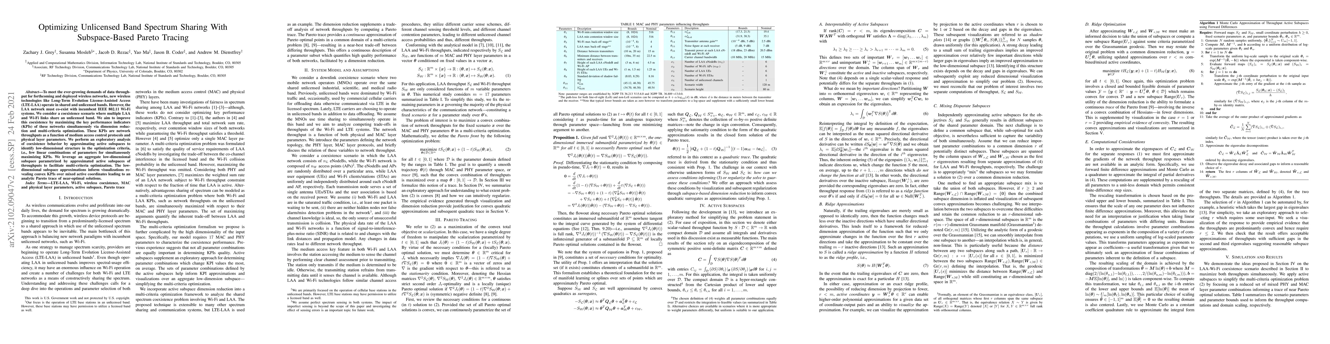 To meet the ever-growing demands of data throughput for forthcoming and deployed wireless networks, new wireless technologies like Long-Term Evolution License-Assisted Access (LTE-LAA) operate in shared and unlicensed bands. However, the LAA network must co-exist with incumbent IEEE 802.11 Wi-Fi systems. We consider a coexistence scenario where multiple LAA and Wi-Fi links share an unlicensed band. We aim to improve this coexistence by maximizing the key performance indicators (KPIs) of these networks simultaneously via dimension reduction and multi-criteria optimization. These KPIs are network throughputs as a function of medium access control protocols and physical layer parameters. We perform an exploratory analysis of coexistence behavior by approximating active subspaces to identify low-dimensional structure in the optimization criteria, i.e., few linear combinations of parameters for simultaneously maximizing KPIs. We leverage an aggregate low-dimensional subspace parametrized by approximated active subspaces of throughputs to facilitate multi-criteria optimization. The low-dimensional subspace approximations inform visualizations revealing convex KPIs over mixed active coordinates leading to an analytic Pareto trace of near-optimal solutions.