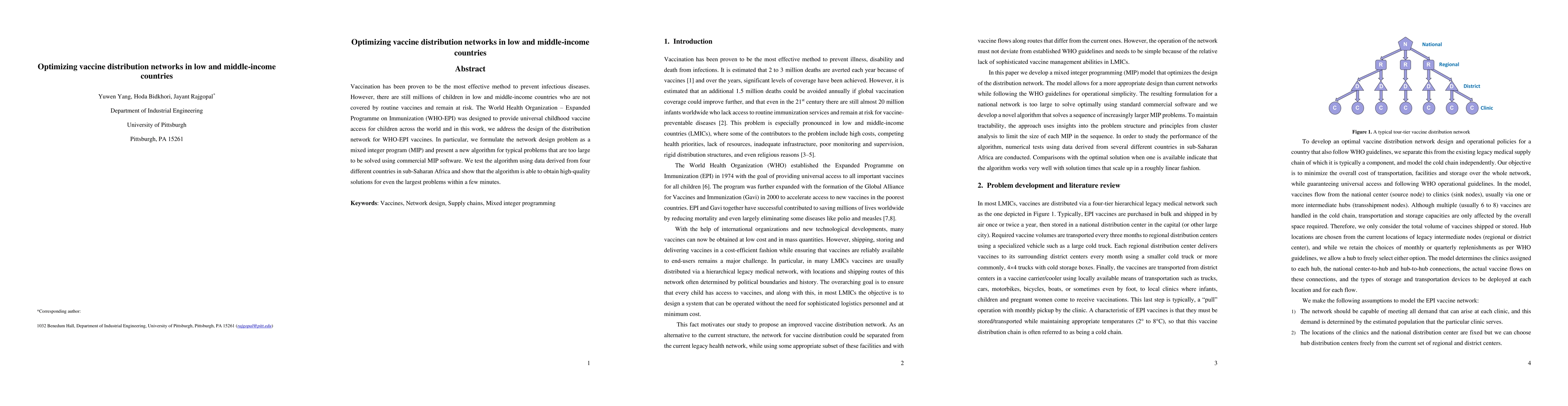 This research develops a mixed integer program to optimize vaccine distribution networks for the WHO-EPI in low and middle-income countries, introducing a new algorithm capable of solving large-scale problems efficiently. The algorithm is tested on data from four sub-Saharan African countries, demonstrating its effectiveness in achieving high-quality solutions quickly.