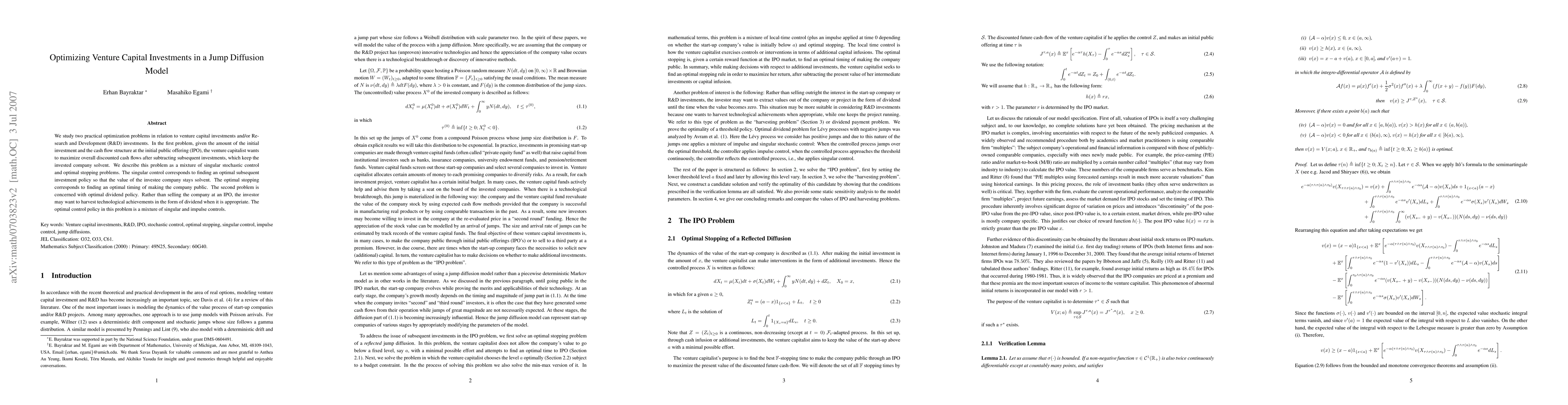 This paper optimizes venture capital investments using a jump diffusion model, solving a singular stochastic control problem to determine optimal subsequent investment policies and an optimal stopping rule for maximizing returns at IPOs. It also addresses the optimal dividend policy, providing a quasi-explicit solution for extracting dividends instead of selling stock, proving its existence, uniqueness, and optimality.
