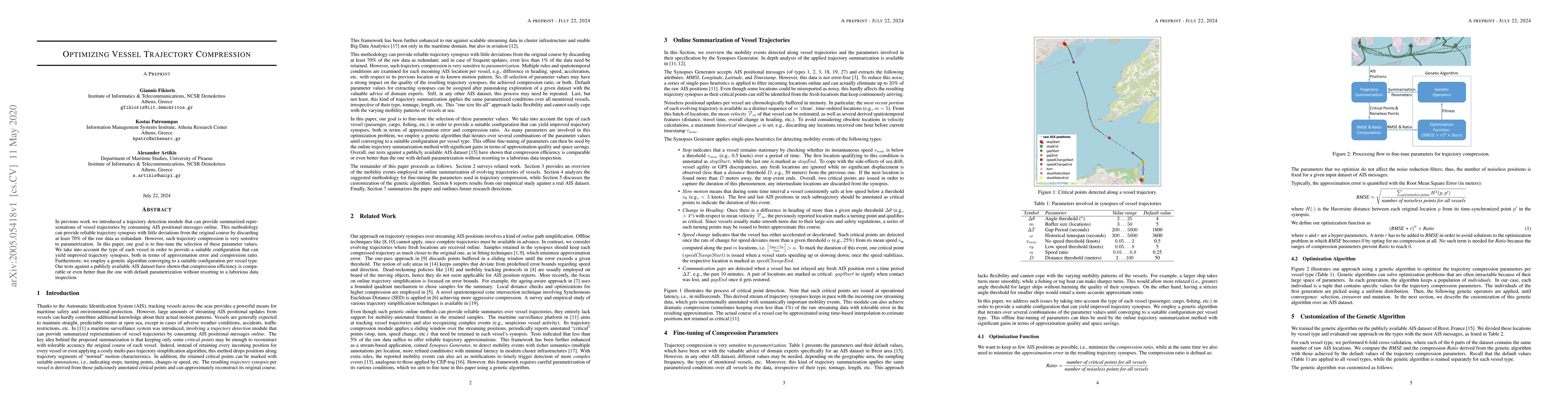This paper optimizes vessel trajectory compression by fine-tuning parameter values for a trajectory detection module, using a genetic algorithm tailored to different vessel types. The approach achieves comparable or superior compression efficiency and approximation error reduction compared to default settings.