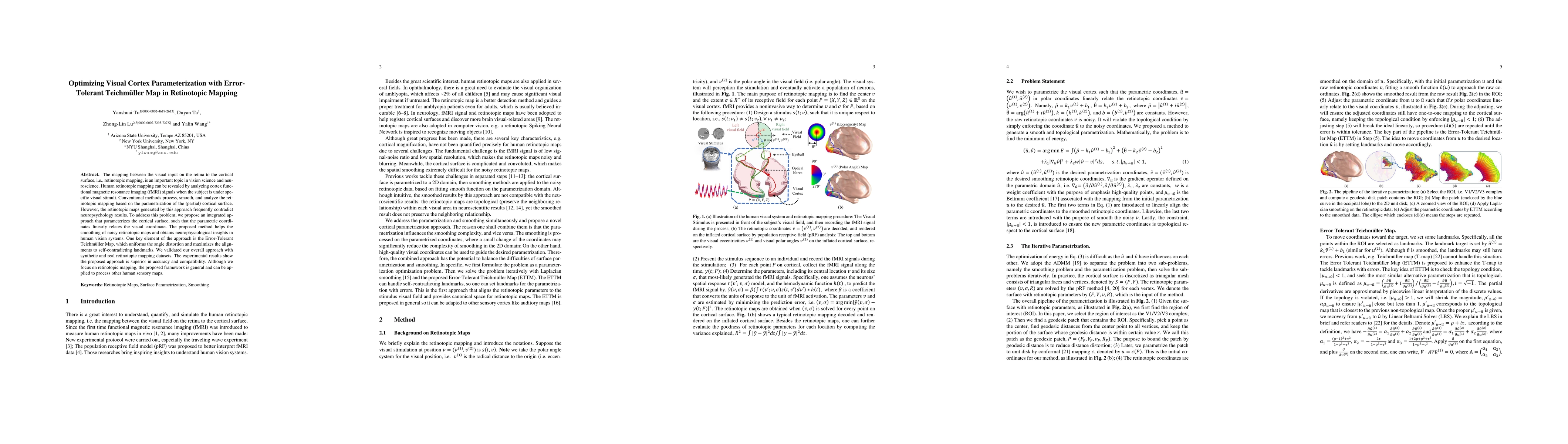 The mapping between the visual input on the retina to the cortical surface, i.e., retinotopic mapping, is an important topic in vision science and neuroscience. Human retinotopic mapping can be revealed by analyzing cortex functional magnetic resonance imaging (fMRI) signals when the subject is under specific visual stimuli. Conventional methods process, smooth, and analyze the retinotopic mapping based on the parametrization of the (partial) cortical surface. However, the retinotopic maps generated by this approach frequently contradict neuropsychology results. To address this problem, we propose an integrated approach that parameterizes the cortical surface, such that the parametric coordinates linearly relates the visual coordinate. The proposed method helps the smoothing of noisy retinotopic maps and obtains neurophysiological insights in human vision systems. One key element of the approach is the Error-Tolerant Teichmuller Map, which uniforms the angle distortion and maximizes the alignments to self-contradicting landmarks. We validated our overall approach with synthetic and real retinotopic mapping datasets. The experimental results show the proposed approach is superior in accuracy and compatibility. Although we focus on retinotopic mapping, the proposed framework is general and can be applied to process other human sensory maps.