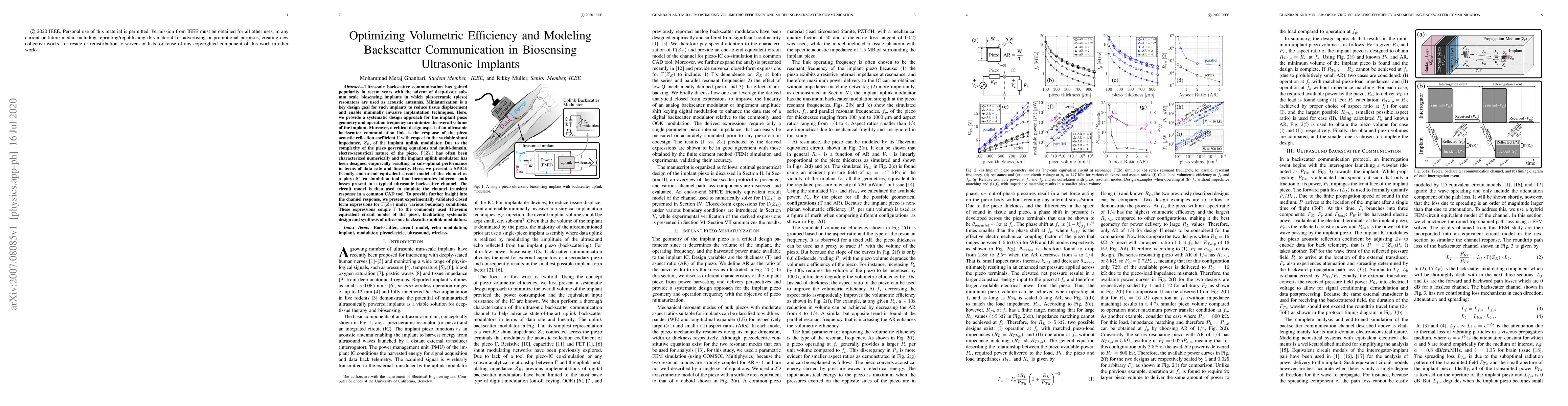 This paper presents a systematic design approach to optimize the volume and efficiency of ultrasonic backscatter communication in sub-mm scale biosensing implants, focusing on the geometry and frequency of piezoceramic resonators. It introduces an equivalent circuit model and closed-form expressions to improve the design of implant uplink modulators, enhancing data rate and linearity.