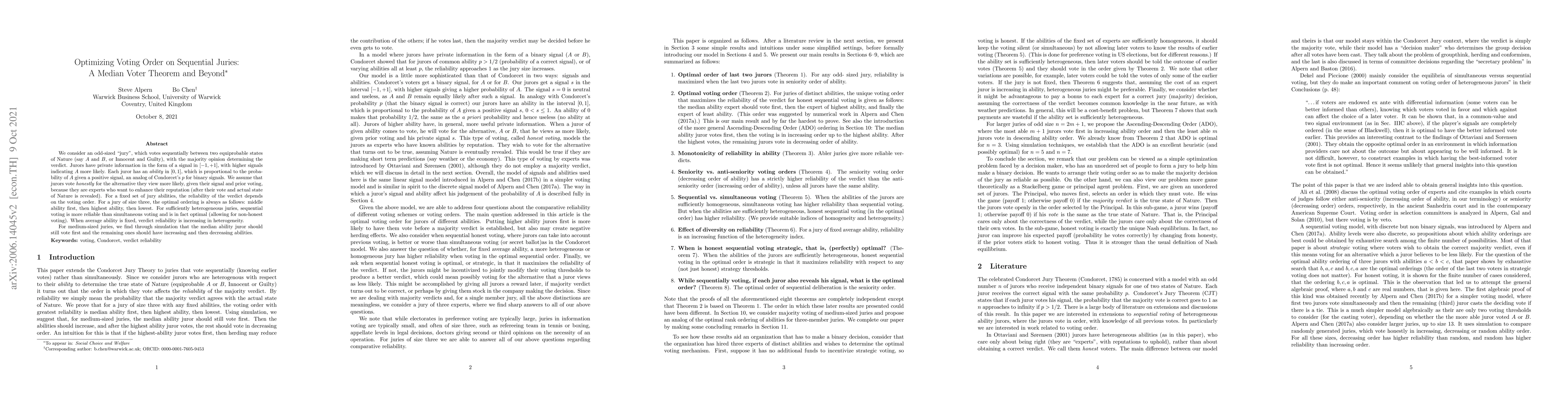 This paper explores the optimal voting order in sequential juries to maximize verdict reliability, finding that for a jury of three, the middle-ability juror should vote first, followed by the highest and then the lowest ability. For larger, heterogeneous juries, sequential voting is more reliable than simultaneous voting, with the median ability juror leading the vote.