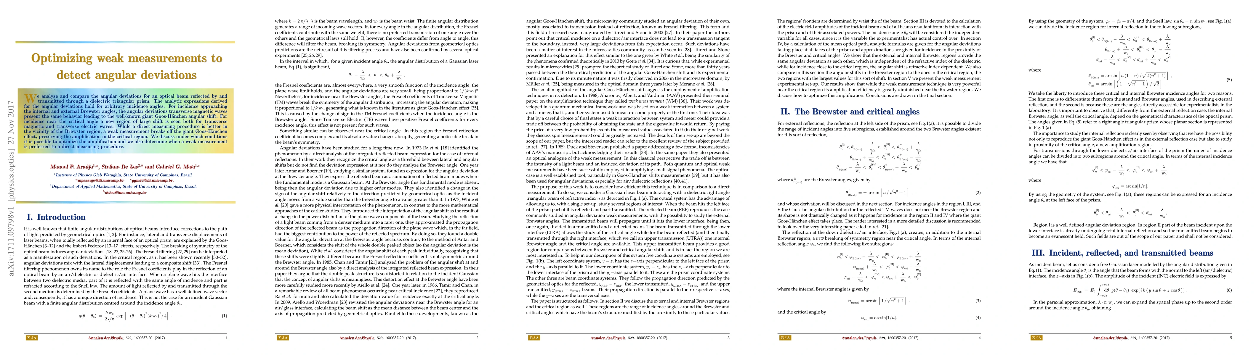 This paper analyzes angular deviations of optical beams as they pass through a dielectric triangular prism, finding that weak measurements can optimize detection of these deviations near the critical angle.